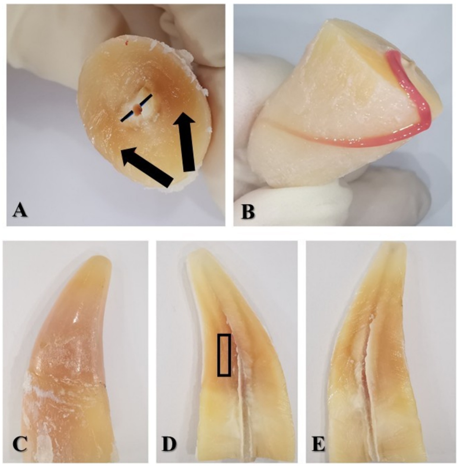 Figure 3. (A) Coronal part of the sectioned tooth—view from the cervical part; black lines—predentin zone; black arrows show the staining of the dentin. (B) The radicular part of the 104 with the coronal part of the dental pulp laid out on the root surface. (C) Coronal part of the sectioned tooth in buccal view. (D) Buccal half of the crown—the pulp chamber stained with dentin. The black rectangle shows the region of the dentin harvested for TEM. (E) Palatal half of the crown—the pulp chamber with dentin staining.