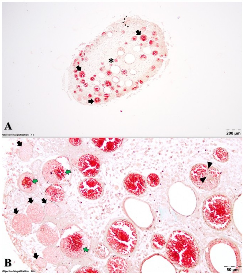 Figure 4. Microstructural aspects of the dental pulp (A) cell-rich zone (accolade) and central part of the coronal dental pulp (asterisk) with an oedematous aspect and numerous ectatic blood vessels (black arrows) and Goldner’s trichrome staining. (B) Dental pulp with numerous occluding fibrinous thrombi (black arrows), some of them showing recanalization (green arrows) and fibrous organization (arrowheads). Goldner’s trichrome staining.