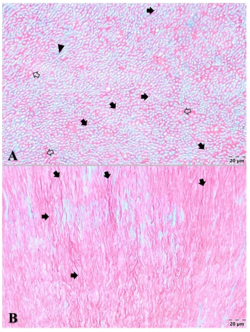 Figure 5. Microstructural aspects of the dentin. (A) Cross-section of dentinal tubules containing odontoblastic processes (black arrows), which are surrounded by the peritubular acidophilic dentin (blank arrows), while the intertubular dentin displayed a basophilic appearance (arrowhead) with Goldner’s trichrome stain. (B) Longitudinally sectioned oedematous odontoblastic processes inside the tubules (black arrows) of the dentin. Goldner’s trichrome stain.