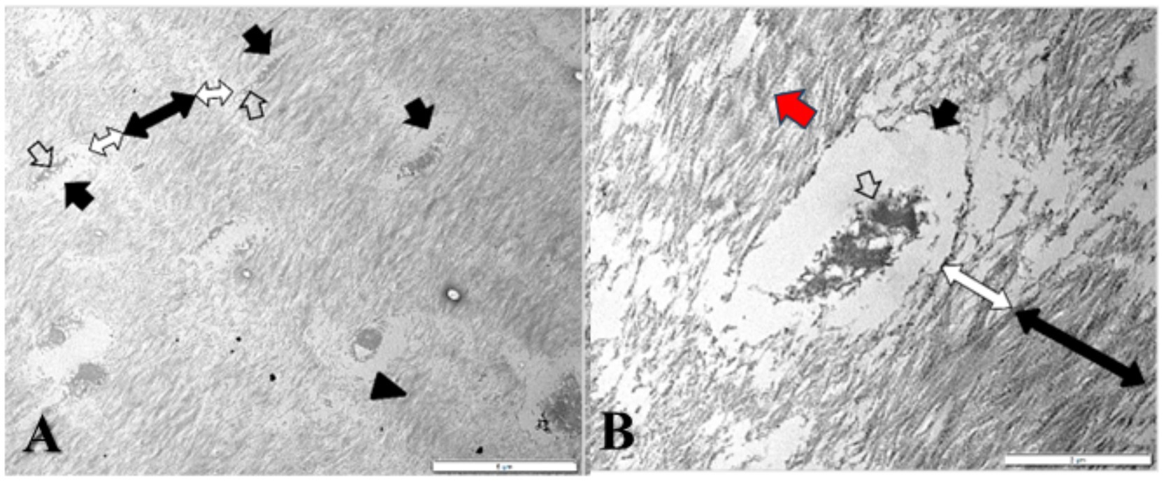 Figure 6. TEM (A) General view of the dentin and (B) Dentinal tubules (black arrows) investing vacuolated odontoblastic processes (white arrows); peritubular dentin (white double-ended arrows) and intertubular dentin (black double-ended arrows) with interlacing collagen bundles (arrowhead) showing a distinctive banding pattern (red arrow).