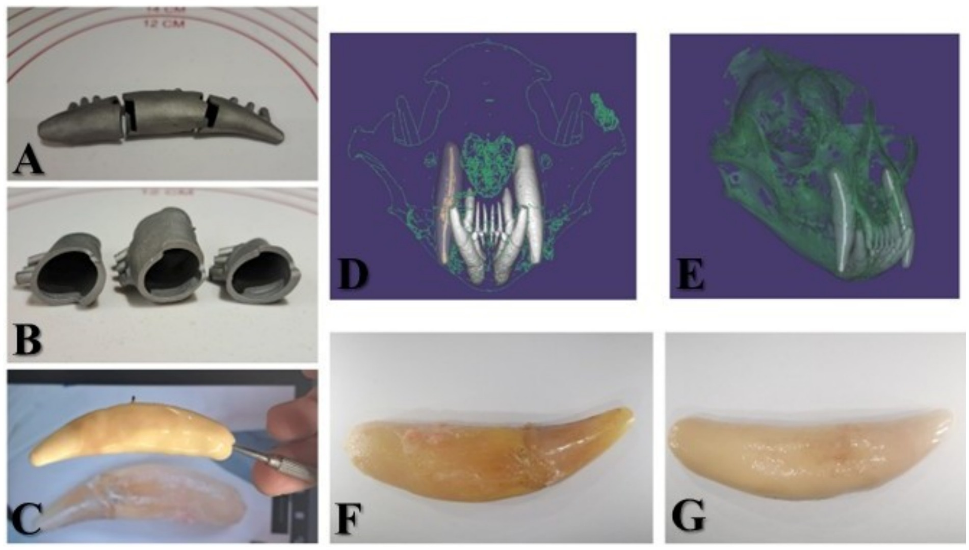 A virtual simulation software (Exocad) enabled the creation of a three-dimensional (3D) digital model based on CT scan images. To create a macroscopically identical tooth, a metallo-ceramic prosthodontic crown was computer-aided designed. CT images provided a 3D volumetric dataset in a standard medical imaging format, Digital Imaging and Communications in Medicine (DICOM). This dataset was imported into Exocad, a specialized dental CAD software. Using segmentation tools, the technician isolated the tooth. After obtaining the virtual model, the technician designed the titanium core of the future canine tooth, with a 2 mm reduction in diameter and a 4 mm reduction in length, to leave a 2 mm width of space for ceramic application around the tooth to obtain aesthetics. In Exocad, additional fine adjustment can be done to ensure margins, occlusion, and functionality. The final design was exported as a stereolithography (STL) file to a CAD module to 3D print the titanium core. As the CAD module was designed for human dentition and the length of the jaguar’s canine tooth was longer than any human tooth, it was necessary to divide the core into three segments. The metal was sandblasted to roughen the surface and improve the bonding with the ceramics. A thin layer of opaque porcelain was applied and fired in a porcelain furnace at approximately 1,000 °C. In addition, the technician applied dentin porcelain and an enamel layer of ceramic, firing the tooth again in the furnace after each layer to sinter the ceramic particles. Shades of pink had to be added to obtain a similar colour to the original tooth. Finally, an external layer of glaze was applied, resulting in a shiny and smooth surface.