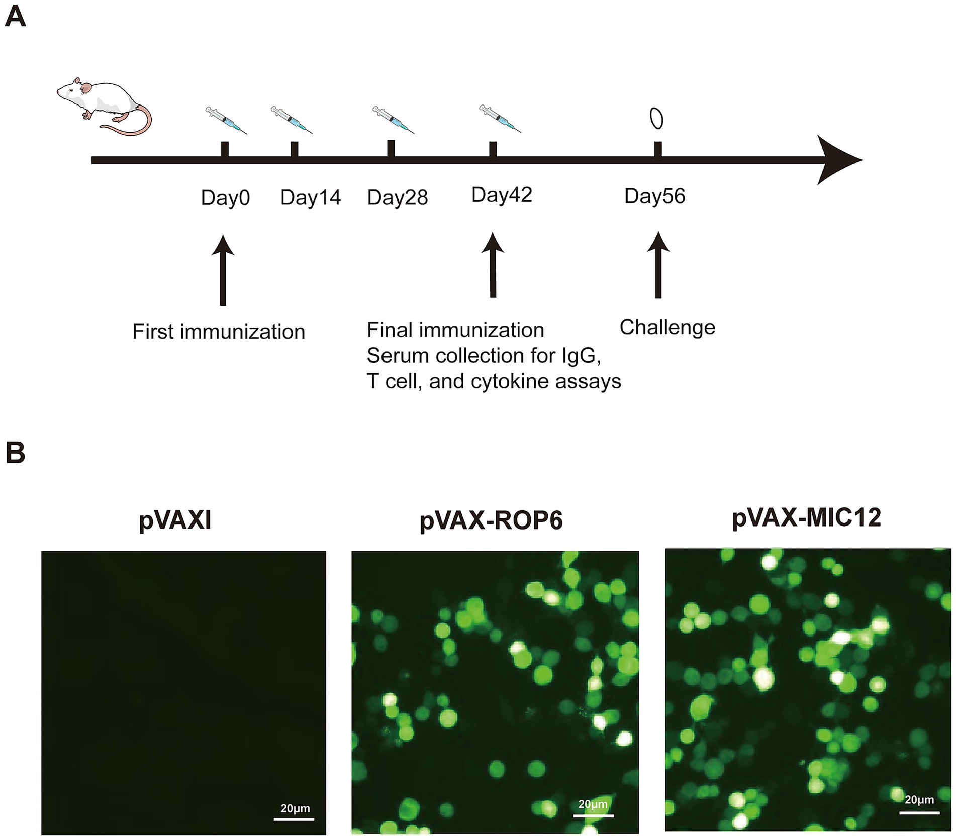 Figure 1. Flow chart of the vaccine immunization strategy and in vitro antigen expression validation. (A) Flow chart of mice immunization and immunological analyses. (B) Protein detection in cells transfected with either empty pVAX I vector (control), pVAX-ROP6, or pVAX-MIC12 constructs.