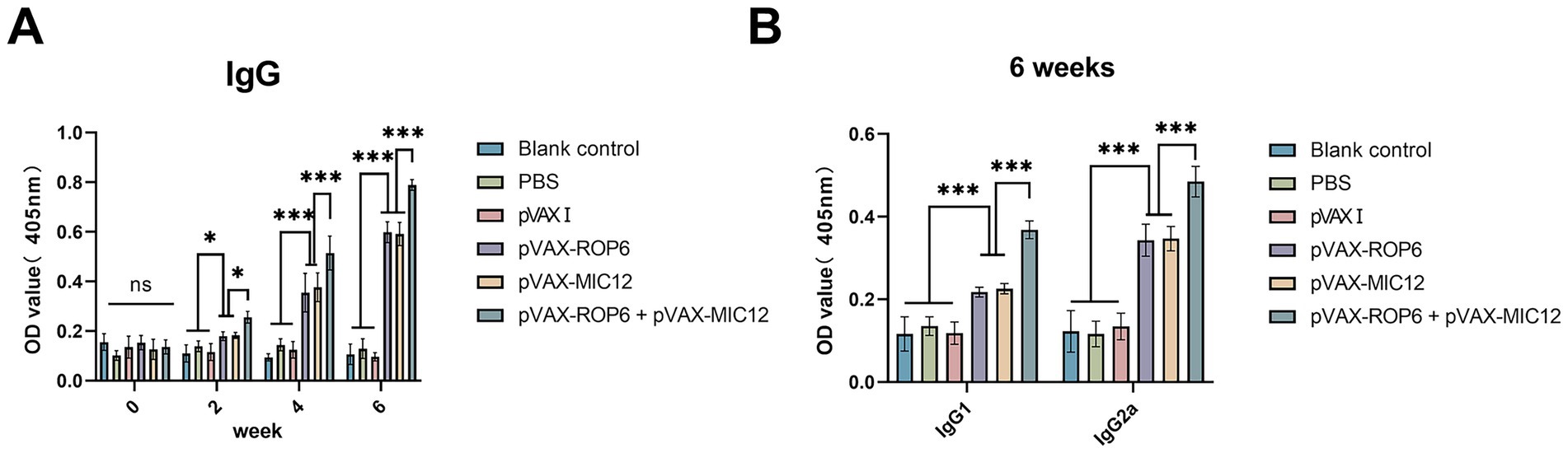 Figure 2. Assessment of humoral immunity induced by single or bivalent gene DNA vaccination. (A) Serum anti-T. gondii IgG antibody levels in BALB\c mice at weeks 0, 2, 4, and 6 post-immunization. (B) Levels of IgG1 and IgG2a subclasses measured 2 weeks after the final immunization. Data are presented as means ± SD (ns, no significant, *p < 0.05, ***p < 0.001).