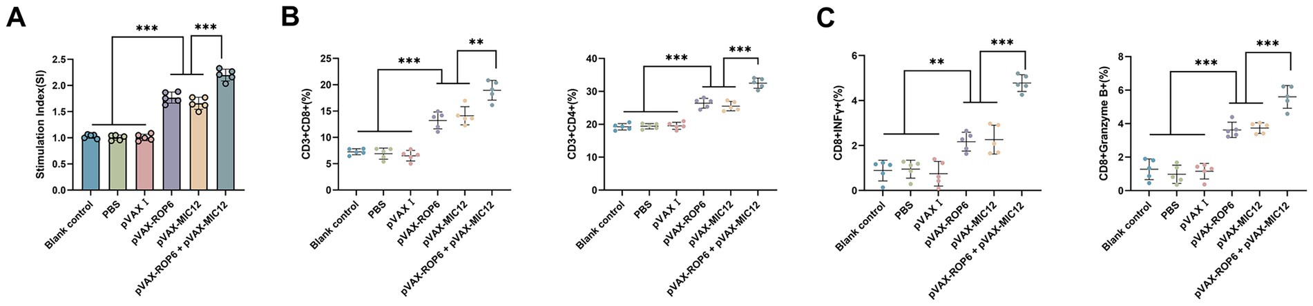 Splenocyte proliferative responses were assessed via MTT assay (Figure 3A). The bivalent vaccine group (pVAX-ROP6 + pVAX-MIC12) exhibited the highest stimulation index (SI) among all groups (p < 0.05), demonstrating superior T cell activation. While the mono formulation (pVAX-ROP6 or pVAX-MIC12) also induced significantly higher SI values than control groups, but there were no any significant differences between single-antigen vaccines (p > 0.05). Also, no notable proliferation was observed in control groups (p > 0.05).