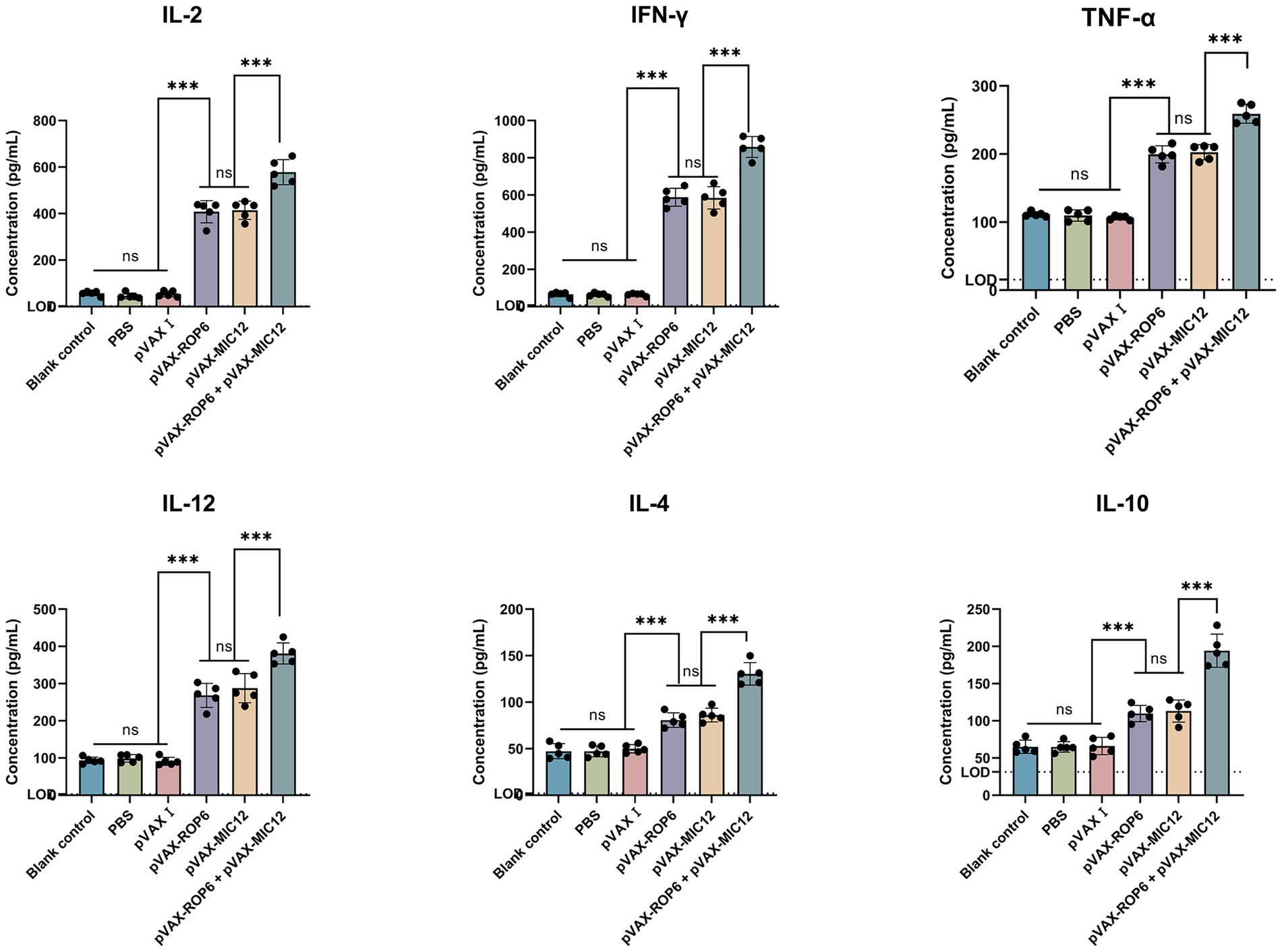 Cytokine analysis of splenocyte supernatants (collected 2 weeks post-immunization) revealed significant Th1 polarization in vaccinated mice (Figure 4). Compared to controls, DNA-immunized groups exhibited elevated TNF-α, IFN-γ, IL-2 and IL-12, with the bivalent formulation (pVAX-ROP6 + pVAX-MIC12) showing superior induction over single-antigen vaccines (p < 0.05). While IL-4 and IL-10 levels showed modest increases, these changes were not statistically significant in the controls (p > 0.05).