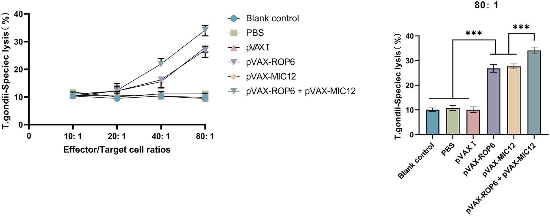 Figure 5. CTL responses of splenic lymphocytes from vaccinated mice. Specific lysis of T. gondii infected target cells (Sp2/0 cells transfected with eukaryotic expression plasmids pVAX-ROP6, pVAX-MIC12 or pVAX-ROP6 + pVAX-MIC12) at varying effector to target (E: T) ratios is shown (mean ± SD; ***p < 0.001).