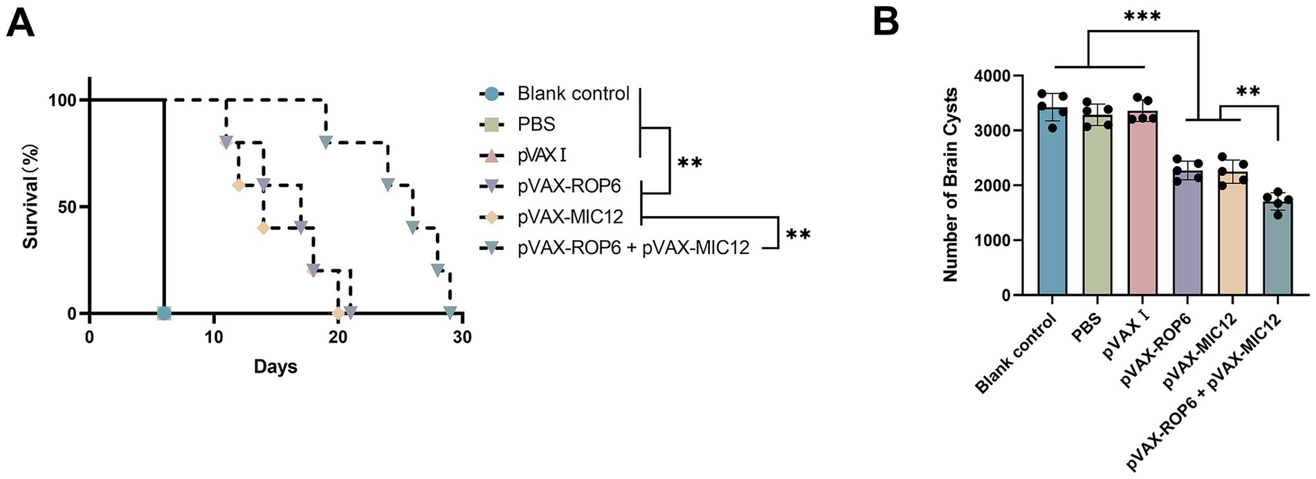 Figure 6. Protective efficacy of vaccination in BALB\c mice. (A) Survival rates following intraperitoneal challenge with 1 × 103 RH strain tachyzoites, administered 2 weeks after the final immunization. Survival was monitored over 30 days. Statistical comparison was performed using the log-rank test. The hazard ratio (HR) for the bivalent vaccine group versus the MIC12 group was 0.5385 (95% CI: 0.1559 to 1.860, p < 0.01), The HR for the bivalent vaccine group versus the ROP6 group was 0.6538 (95% CI: 0.1893 to 2.259, p < 0.01), as determined by Cox proportional hazards regression. (B) Brain cyst burden quantified 4 weeks post-challenge with 20 PRU cysts, representing chronic infection. Data are presented mean ± SD (**p < 0.01, ***p < 0.001).