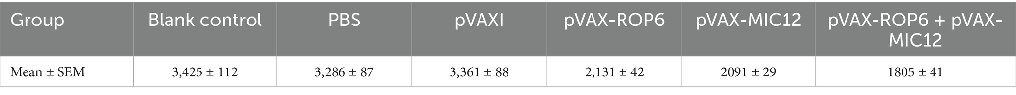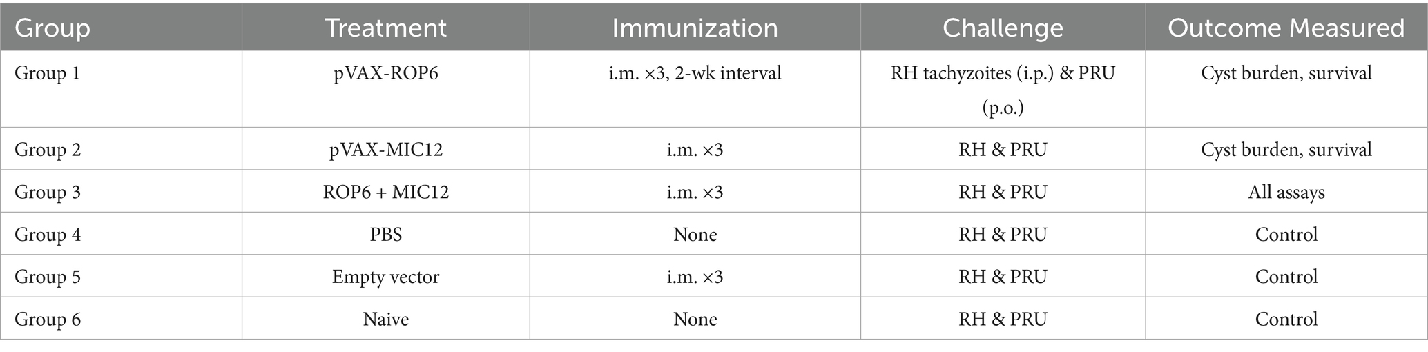 Experimental groups (n = 30 per group) received intramuscular immunizations with 100 μL (100 μg) of DNA vaccines - pVAX-ROP6, pVAX-MIC12, their binary (1:1, the dual vaccine was mixed before injection) combination, − administered at 2-week intervals, while control groups received PBS, empty pVAX1 vector, or remained naive. Serial blood collections at weeks 0, 2, 4, and 6 post-immunization yielded sera through clotting (37 °C, 30 min) followed by centrifugation (4,000 × g, 5 min, 4 °C). Two weeks post-final immunization, parallel challenge studies were conducted: (i) intraperitoneal injection of 1 × 103 RH strain tachyzoites (n = 10/group) with 30-day survival monitoring, which is widely used to induce a lethal acute infection in mouse models, enabling clear evaluation of vaccine-induced protection in a stringent model (27, 28) and (ii) oral inoculation with 20 PRU strain cysts (n = 5/group) followed by brain cyst burden quantification at 4 weeks post-infection, which was chosen for oral challenge to simulate natural infection and assess the ability of the vaccine to reduce chronic cyst formation in the brain, as supported by earlier studies using comparable models (26, 29).