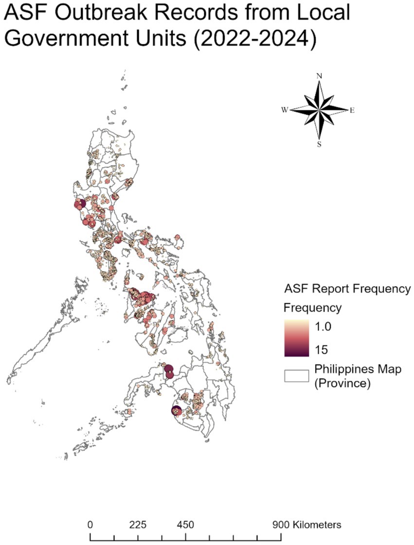 African swine fever (ASF) is a critical concern to the global pig industry and food security due to high disease fatality and associated economic impacts (1). The causal agent, ASF virus (ASFV) is a large DNA virus and sole member of the family Asfarviridae (2). In the Philippines, ASF has had considerable economic and social consequences since the first confirmed outbreak in July 2019 (3, 4), with estimated losses reaching around PHP 100 billion (US$1.78 billion) in 2023 (5, 6). Since disease emergence, epidemiological investigations have revealed spatiotemporal clustering of outbreaks, particularly during seasonal peaks from August to October (7), indicating persistent environmental and human-mediated drivers. Despite national efforts, such as routine surveillance updates provided by the Bureau of Animal Industry (BAI) (7), the disease exhibits a recurring pattern (Figure 1), indicating an urgent need for enhanced surveillance, targeted policy interventions, and effective, evidence-based repopulation protocols to support ASF management and pig industry recovery. In response to the widespread impact of ASF, the Philippine government introduced several key programs and policies to control the disease and aid swine population recovery. As summarized by Fernandez-Colorado et al. (8), one of the earliest efforts was Administrative Circular No. 12, Series of 2019, issued by the Philippine Department of Agriculture, which established the National Zoning and Movement Plan to regulate pig movement and safeguard ASF-free zones. This was later followed by the launch of the National ASF Prevention and Control Program (NASFPCP) through Administrative Order No. 07, Series of 2021, led by the Department of Agriculture’s Bureau of Animal Industry, with the objective of combating the spread and impact of ASF and improving local surveillance and farm biosecurity. To complement these efforts, the twin programs Bantay ASF sa Barangay (BABay ASF) for local monitoring and Integrated National Swine Production Initiatives for Recovery and Expansion (INSPIRE) were introduced for repopulation efforts and to help stabilize the hog industry (8–10). Moreover, technical and strategic support has been provided by international partners, including the Food and Agriculture Organization (FAO) through its Emergency Centre for Transboundary Animal Diseases in the Asia-Pacific region (11). At the national level, the Philippine Department of Agriculture (DA) has demonstrated its commitment to ASF control by allocating PHP 350 million (US$6.2 million) for vaccine procurement from Vietnam, with the goal of administering 600,000 doses to support and accelerate the national prevention and control efforts in 2024 (12, 13).