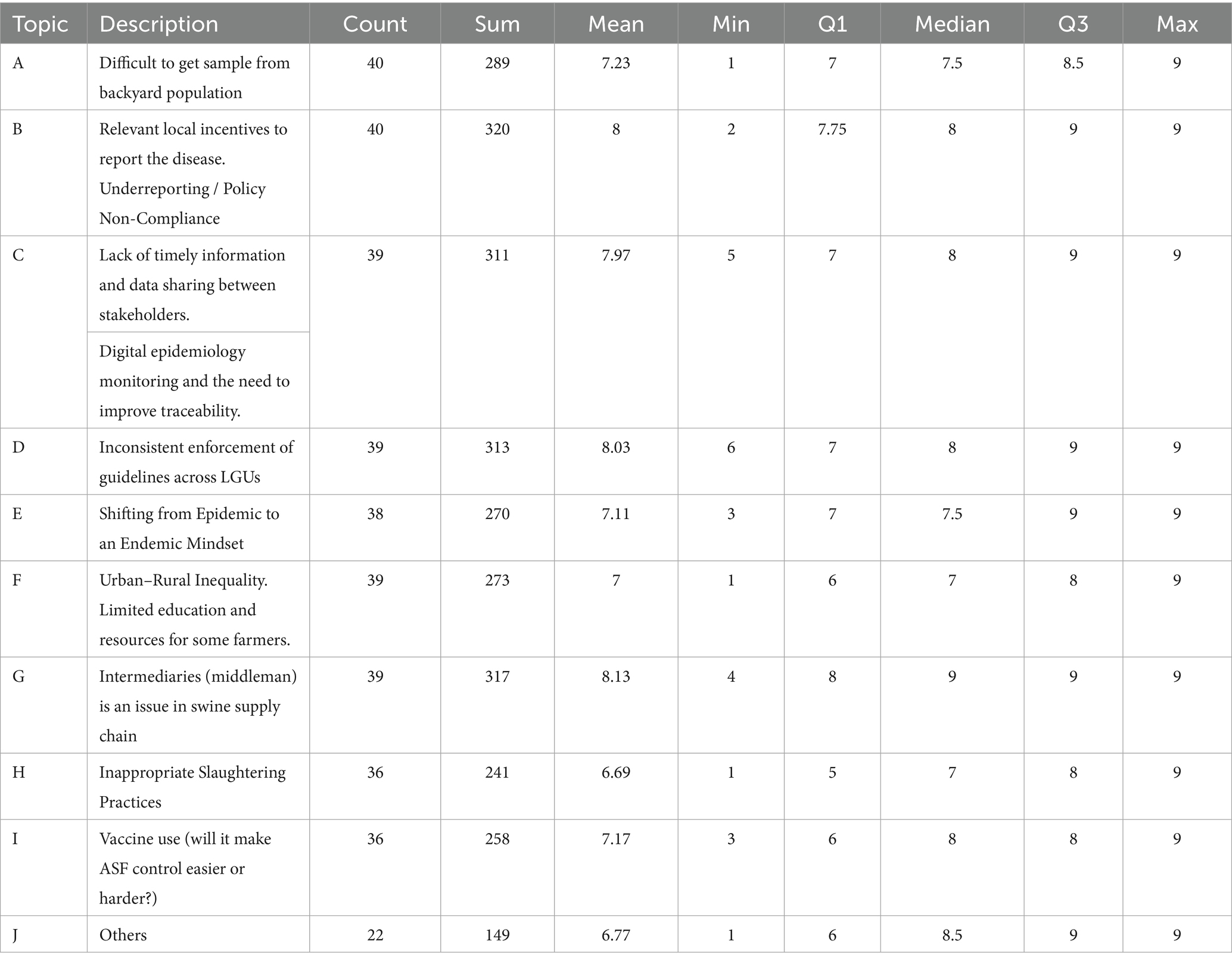 To localize these efforts, we co-developed a context-specific prioritization activity—revising the global research priority list to reflect the local challenges and practical needs of the Philippine swine industry—in partnership with representatives from the Philippine College of Swine Practitioners (PCSP) and field veterinarians. This prioritization exercise was conducted as part of a capacity-building workshop held in November 2024. We designed and distributed a structured questionnaire using Qualtrics, targeting a total of 40 participants. This group included government officials, field veterinarians, and swine industry experts, all of whom had direct experience with ASF surveillance, diagnostics, outbreak response, or swine production across various regions of the Philippines. The questionnaire was contextually adapted through PCSP expert consultation. This adaptation contributed to the identification and refinement of nine key variables. An open-ended “Other” option was added to capture emerging or context-specific concerns not covered by the predefined categories. The full questionnaire was attached as a Supplementary file. Respondents were asked to rate the importance of each of the nine topics on a Likert scale ranging from 1 (not important at all) to 9 (very important). The responses were analyzed to calculate average importance scores, along with minimum and maximum values and response counts for each variable (see Table 1).