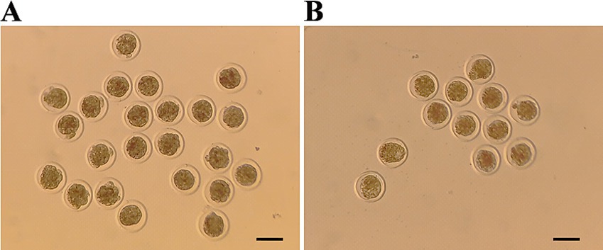 Figure 1. Partially collected embryos on D22 of the spontaneous estrus (SE) and D19 of the induced estrus (IE) groups. (A) SE group. (B) IE group. Scale bar: 100 μm.