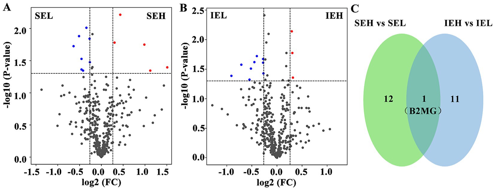 Figure 2. Analysis of differentially expressed proteins (DEPs) in ovine serum during superovulation. (A) Volcano plot showing the SEH and SEL comparison. SEH: High embryonic yield population in the SE group. SEL: Low embryonic yield population in the SE group. (B) Volcano plot showing the IEH and IEL comparison. IEH: High embryonic yield population in the IE group. IEL: Low embryonic yield population in the IE group. (C) Venn diagram showing the shared DEPs analysis results (N = 5).