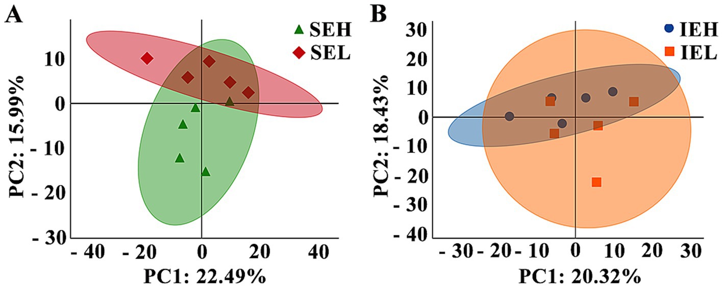 Figure 3. Principal component analysis (PCA) of ovine serum proteome during superovulation. (A) The SEH and SEL comparison. SEH: High embryonic yield population in the SE group. SEL: Low embryonic yield population in the SE group. (B) The IEH and IEL comparison. IEH: High embryonic yield population in the IE group. IEL: Low embryonic yield population in the IE group. The colored points in the graph indicate the individual samples (N = 5).
