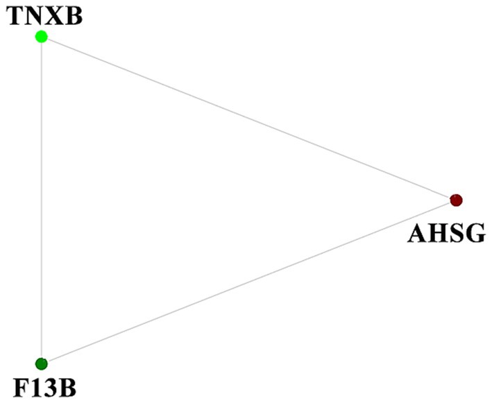 To discover the blood protein interaction network during ovine superovulation, a protein interaction network was constructed using the DEPs. Three DEPs in the IE group, namely TNXB, AHSG, and F13B, were found to interact, each of which was involved in different pathways (Figure 4).