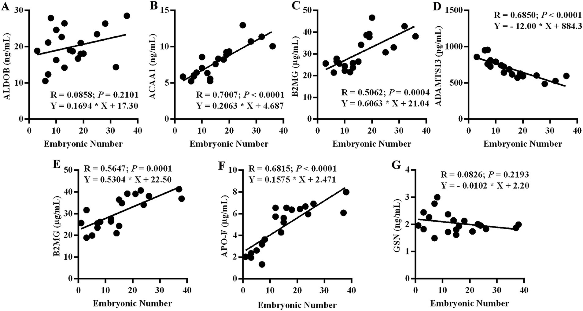 Figure 5. ELISA results for the partial DEPs. The correlation between DEP expression levels and embryo yield was analyzed using linear regression. (A) ALDOB in the SE group. (B) ACAA1 in the SE group. (C) B2MG in the SE group. (D) ADATMS13 in the SE group. (E) B2MG in the IE group. (F) APO-F in the IE group. (G) GSN in the IE group. SE, Spontaneous Estrus; IE, Induced Estrus (N = 19).