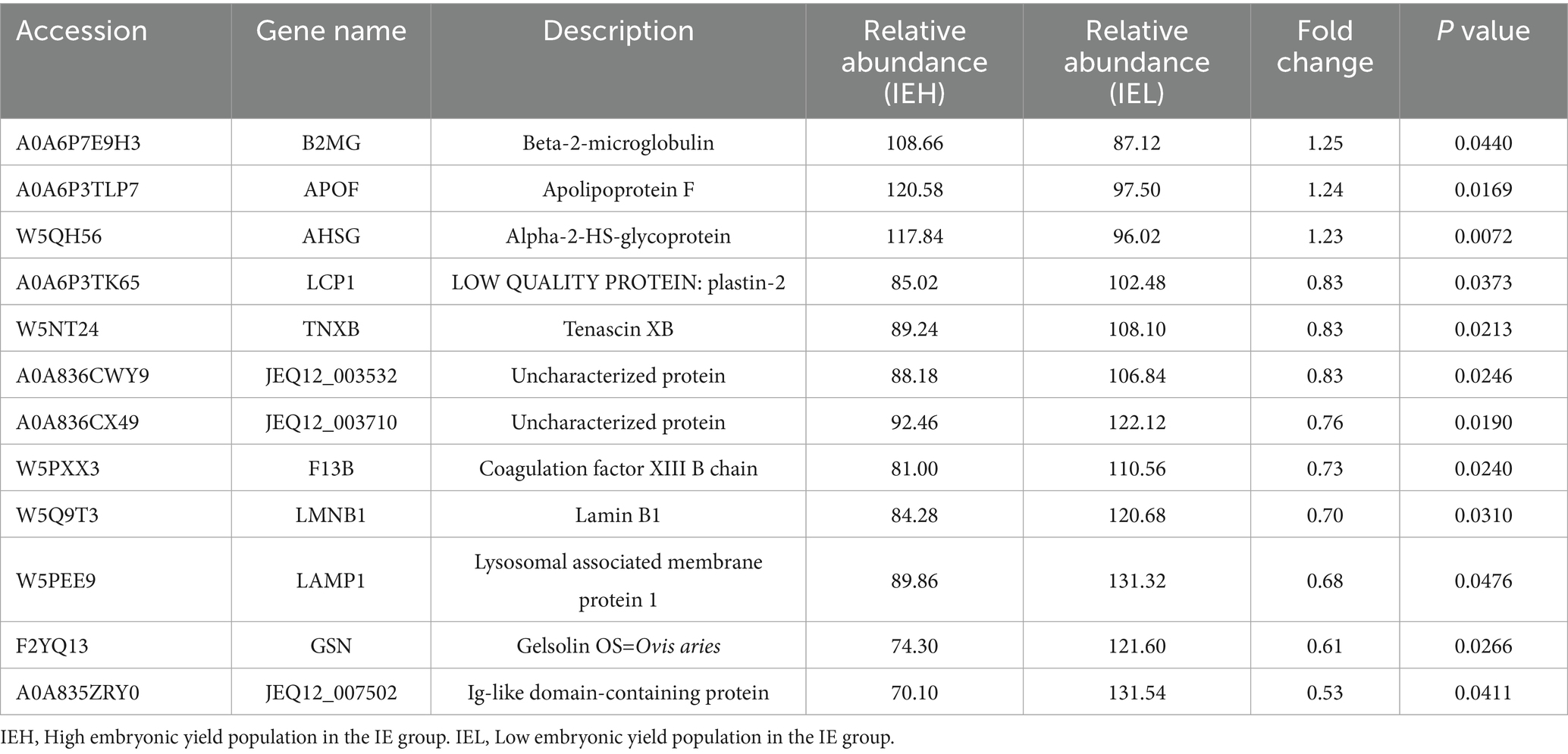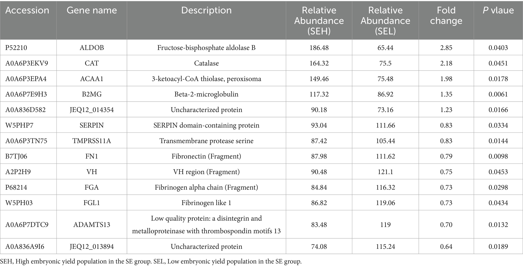 In essence, superovulation refers to stimulating the maturation of original small follicles in the ovaries. Therefore, the detection of the status of original small follicles via ultrasound is an efficient way to predict the embryonic yield (2–7). Nevertheless, this process can be complex and necessitates technical know-how. In addition, the stress endured by donors cannot be overlooked. Therefore, the use of non-invasive methods would be beneficial in this context. Previously, we found that follicle-stimulating hormone (FSH), progesterone (P4), anti-müllerian hormone (AMH), phosphatidyl choline (PC)-related metabolites, and some amino acids in the blood were associated with superovulation results (8). Studies have shown that blood proteins are associated with reproductive capacity. For instance, plasma protein Z concentration has been demonstrated to be associated with adverse pregnancy outcomes, including recurrent miscarriage, stillbirth, preeclampsia, intrauterine growth restriction, and placental abruption (9). The human leukocyte antigen in blood has been shown to be associated with recurrent implantation failure (10). However, the literature on the relationship between blood proteins and the effectiveness of superovulation in livestock is limited.