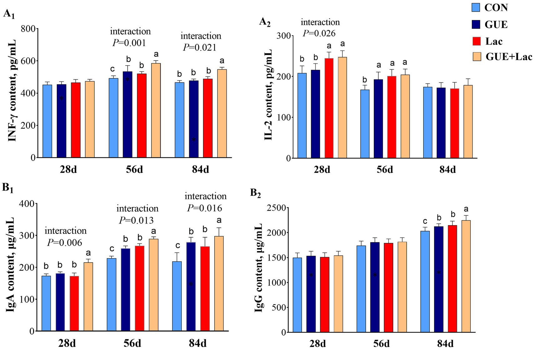 Furthermore, the combined application GUE+Lac demonstrated a positive interaction effect, resulting in increased serum levels of IL-2 and IgA at day 28, INF-γ and IgA at day 56, and INF-γ, IgA and IgG at 84. These results suggested GUE and L. acidophilus could synergistically boost the immunity by stimulating the secretion of immune factors and anti-inflammatory cytokines in broilers. This could be interpreted as L. acidophilus accelerating the biotransformation and absorption of the bioactive components in GUE by utilizing the catabolic properties of probiotics, while GUE promotes the proliferation of probiotics, thereby building a mutually reinforcing mechanism. However, further research is needed to fully understand this mechanism.