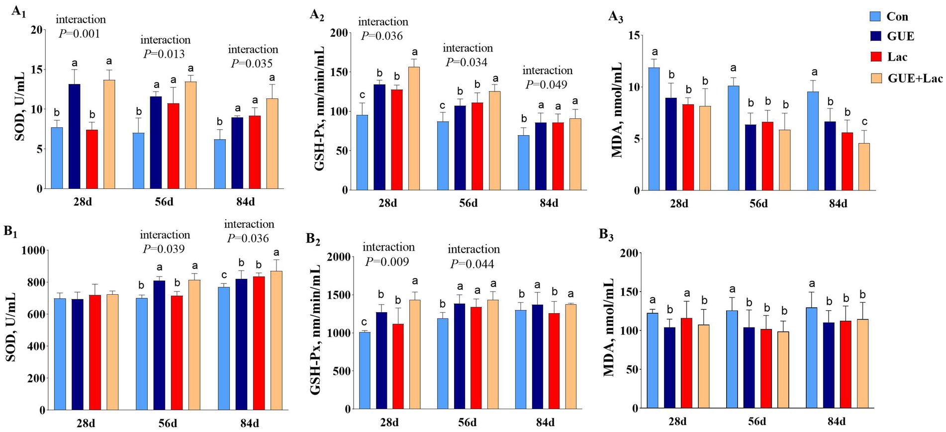 Figure 2. Effects of GUE, Lac, and their combined supplementation on serum (A1–A3) and live (B1–B3) antioxidant parameters. CON, control; GUE, Glycyrrhiza uralensis extract; Lac, Lactobacillus acidophilus; SOD, superoxide dismutase; GSH-Px, glutathione peroxidase; MDA, malondialdehyde. Data are presented as mean ± SD (n = 14). a,b,cMeans denoted by different superscripts are significantly different (p < 0.05).