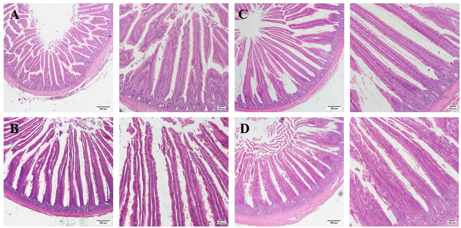 Figure 3. Histological representations of the H and E-stained jejunal sections of broilers at 28 days of age. (A) CON group; (B) GUE group; (C) Lac group; (D) GUE+Lac group. Scale bars represent 200 μm and 100 μm, respectively.