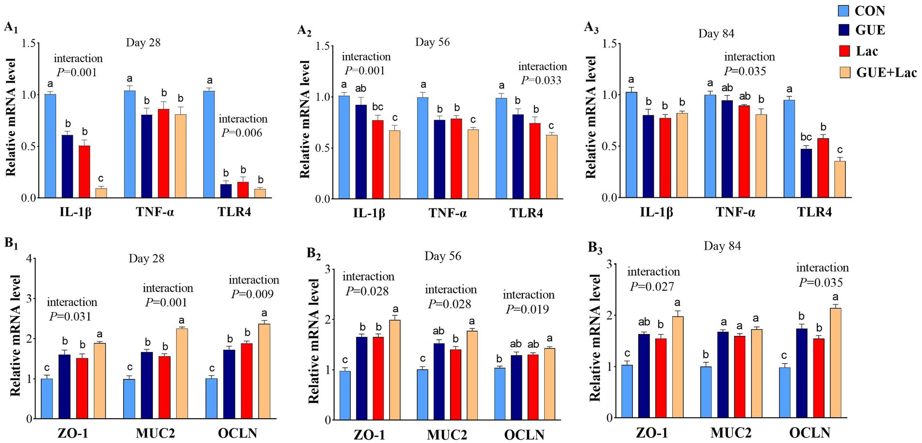 Supplementation of both GUE and Lac reduced the expression of IL-1β and TLR4 in the jejunal mucosa of broilers at 28, 56 and 84 days, and the TNF-α expression at days 28 and 56. GUE+Lac showed an interactive effect, leading to further decreased the expression of IL-1β at day 28 and TNF-α and TLR4 at day 56 compared to the GUE and Lac groups (p < 0.05) (Figure 4A1–A3). Both GUE and Lac upregulated the expression of ZO-1 and MUC2 at days 28, 56 and 84, and the expression of OCLN at days 28 and 84 (p < 0.05). Additionally, the interaction of GUE+Lac was observed, which increased the expression of ZO-1 and OCLN at days 28 and 84 compared to the GUE and Lac groups (p < 0.05) (Figure 4B1–B3).