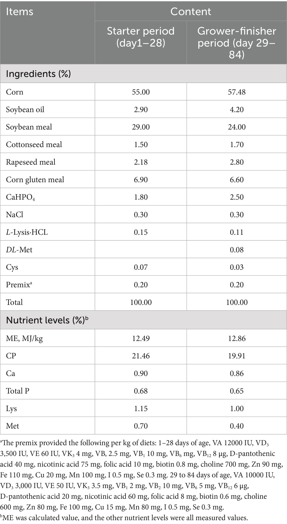 The trial was conducted at Gansu Agricultural Vocational Farm Co., Gansu, China. The chickens were housed in 3-layer ladder-type cages from 1 to 28 days old, and the nursery was preheated before the birds were introduced. The temperature inside the nursery was maintained at 34 °C with a relative humidity (RH) of 50% during the first week, gradually decreasing by 2 °C each week until the coop temperature reached 26 °C with RH at 45%. From 29 to 84 days old, the broilers were raised on the ground with the coop temperature at 26 °C and RH at 45%, ensuring the coop remained dry, hygienic, and well-ventilated. All the broilers were kept in a single room comprising four floor pens, each measuring 400 × 500 cm. Each pen had solid white plastic walls and was divided by wire mesh into 7 compartments. These compartments were equipped with a round feeder pan (diameter = 50 cm) and one nipple drinker. Cork shavings were used as bedding and were replaced every 3 days. The experiment lasted 84 days. During the test period, chickens had ad libitum access to feed and water. They were vaccinated with the Newcastle disease vaccine and the infectious bursal disease polyvalent vaccine at 7 and 14 days of age, respectively (21).