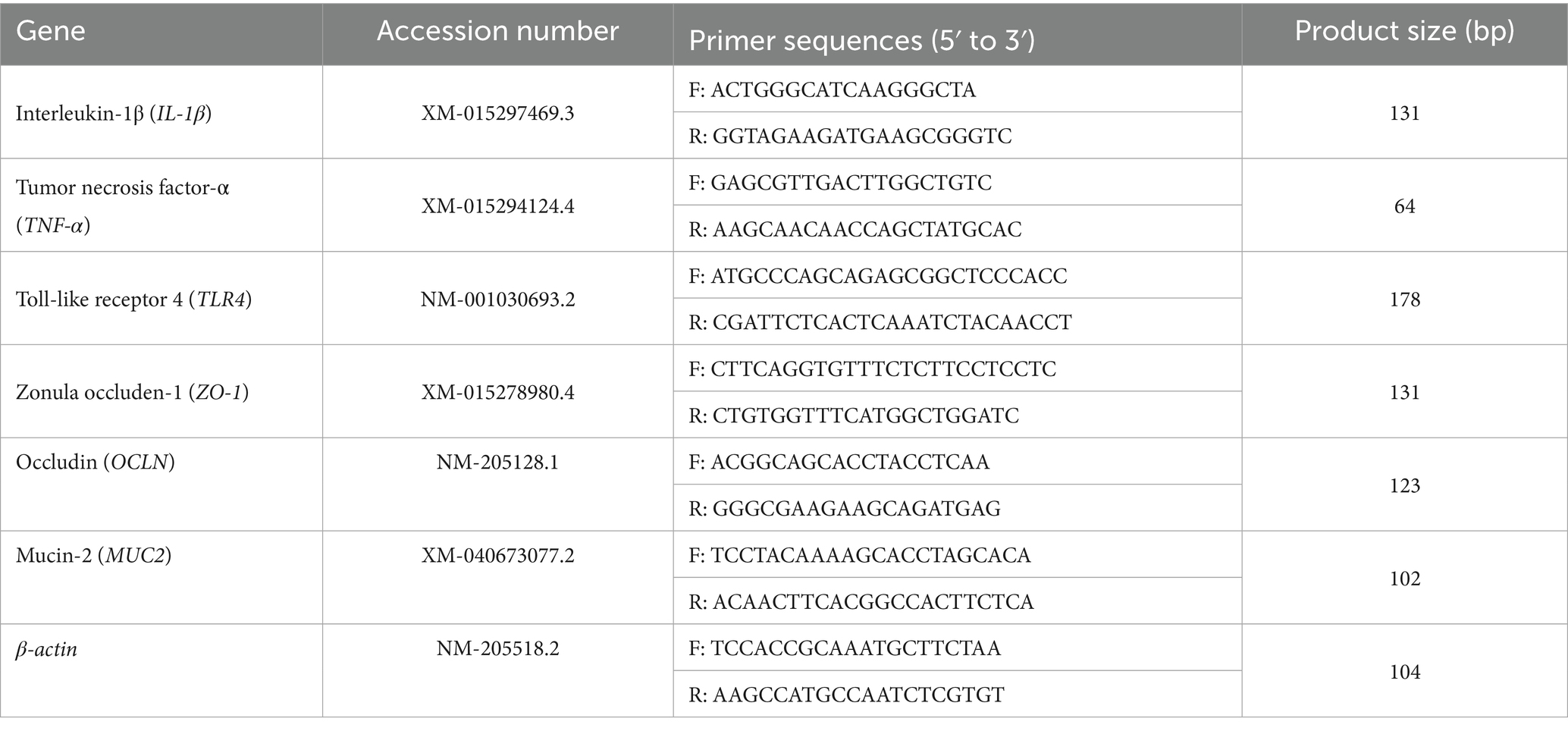 On the last day of the starter stage (days 1–28), the grower stage (days 29–56), and the finisher stage (days 57–84), that was on day 28, 56 and 84 of the experiment, after a 12-h fasted feeding, 2 broilers were randomly selected from each replicate, with a total of 14 broilers per group for sampling. 5 mL of blood samples were collected from the wing vein of each individual, and serum was obtained by centrifuging at 3,000 rpm for 10 min. After that, the broilers were euthanized by severing the jugular vein and dissected immediately, and the thymus, bursa of Fabricius, and spleen were collected and weighed. The ratio of organ weight to body weight was used to determine relative organ weights (g/kg); approximately 5 g samples of liver, and breast muscle were collected; approximately 5 cm of intestinal segments from the middle of the jejunum (from the most distal insertion point of the duodenal mesentery to the junction with Meckel’s diverticulum) were excised. The jejunum samples were gently rinsed with ice-cold phosphate-buffered saline (PBS; pH 7.4) and split into two segments. One segment was immediately fixed in 10% paraformaldehyde solution for paraffin section, and the other was longitudinally cut and the mucosa gently scraped into a sterile tube using a sterilized glass slide for RT-PCR.