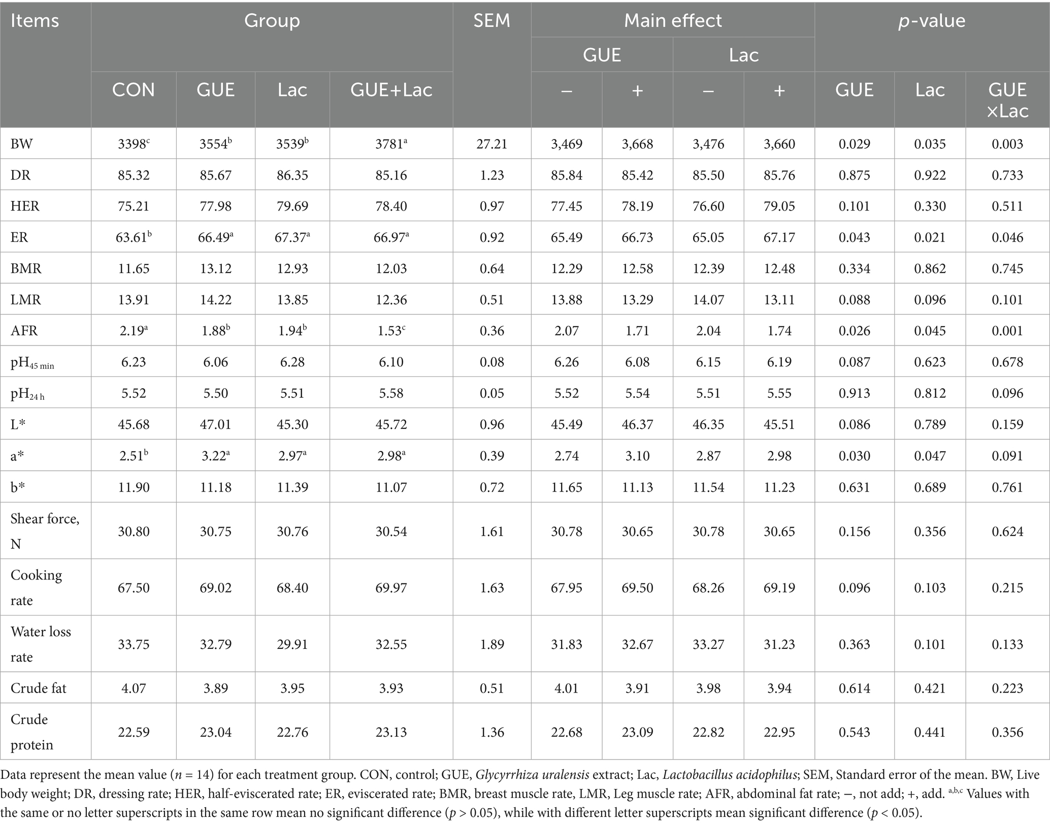 GUE, a water-soluble extract of Glycyrrhiza uralensis containing various bioactive components, promoted the colonization of beneficial bacteria while inhibiting the growth of harmful bacteria in the gut of broilers through its bioactive substances (16), thereby aiding probiotics like Lactobacillus in exerting their effects. Certain plant polysaccharides enhanced the growth of beneficial gut bacteria, while probiotics could also facilitate the absorption and utilization of active plant substances (17). Synbiotic benefits can also be driven by probiotic carbohydrate-metabolizing enzymes, enabling utilization of specific oligosaccharides and enhancing probiotic survival, as shown in epilactose-producing cellobiose 2-epimerase systems (18). Studies have confirmed the effects of Lactobacillus on growth performance in fast-growing broilers, as well as the synergistic benefits of synbiotics composed of probiotics and medicinal plants, such as Astragalus and their active components (19, 20). Our previous study also demonstrated that GUE effectively mitigated the damage caused by Deoxynivalenol (DON)-Zearalenone (ZEN) contamination (21); both GUE and Lactobacillus acidophilus as feed additives enhanced growth performance and improved the balance of intestinal microecology in the cecum, and their combined use showed an even more positive effect in Liangfenghua broilers (22), a medium-growing strain popular for its excellent meat quality. This study was conducted to further investigate their effects on carcass trait, meat quality, immune and antioxidant functions, and intestinal health, aiming to understand the mechanisms underlying their promotion of broiler production.