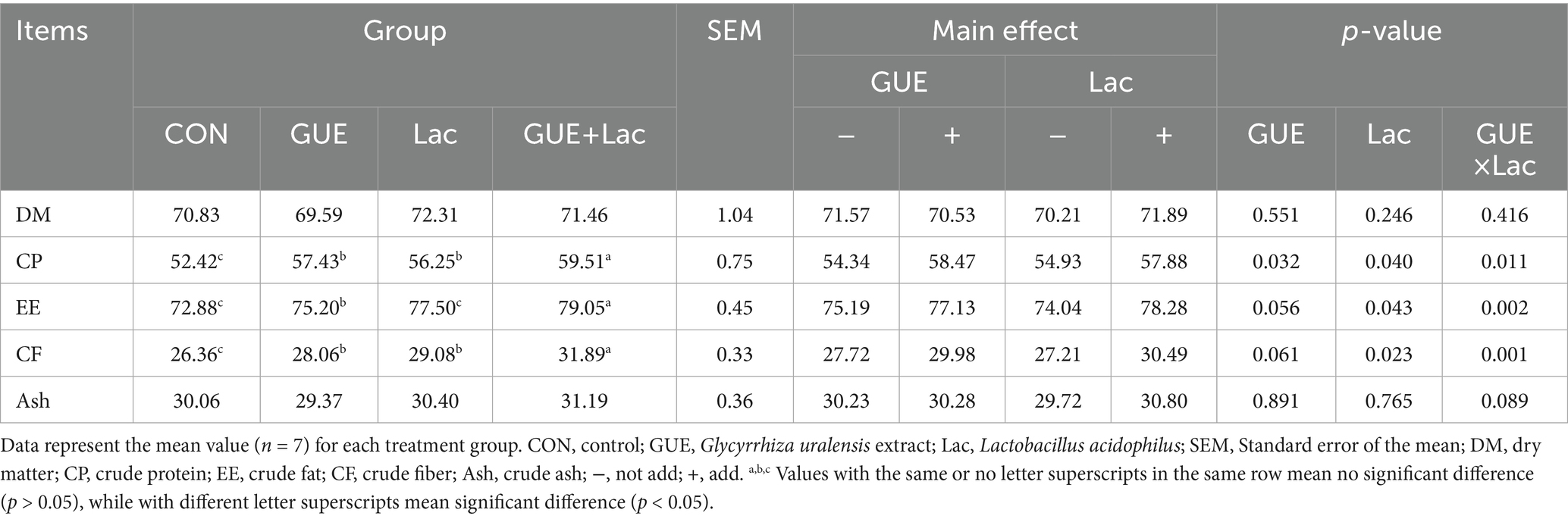 Additionally, both supplementary GUE and L. acidophilus increased the apparent metabolic rates of CP, EE, and CF in broilers. These findings indicated that, similar to fast-growing broilers (33), L. acidophilus enhanced production performance and feed utilization in medium-growing broilers by improving the digestion, absorption, and utilization of feed nutrients. Previous studies indicated that Lactobacillus enhanced the growth performance and the apparent metabolic rate of CP in broilers (20, 34). These effects can be related to the improvement of structure of intestinal flora (34), intestinal morphology, and the abundance of bacteria producing short-chain fatty acids (35). Glycyrrhiza uralensis alleviated intestinal inflammation by inhibiting pro-inflammatory factors (e.g., IL-6 and IL-1β) (36), and mitigated ulcerative colitis by repairing mitochondrial damage and increasing SOD, GSH-PX, and IL-10 levels in intestinal epithelial cells (37). These mechanisms collectively maintained the synthesis and activity of digestive enzyme by preventing inflammation and oxidative stress. Accordingly, both GUE and L. acidophilus supplementation could improve the production performance of broilers by promoting the digestion and absorption of nutrients (38).