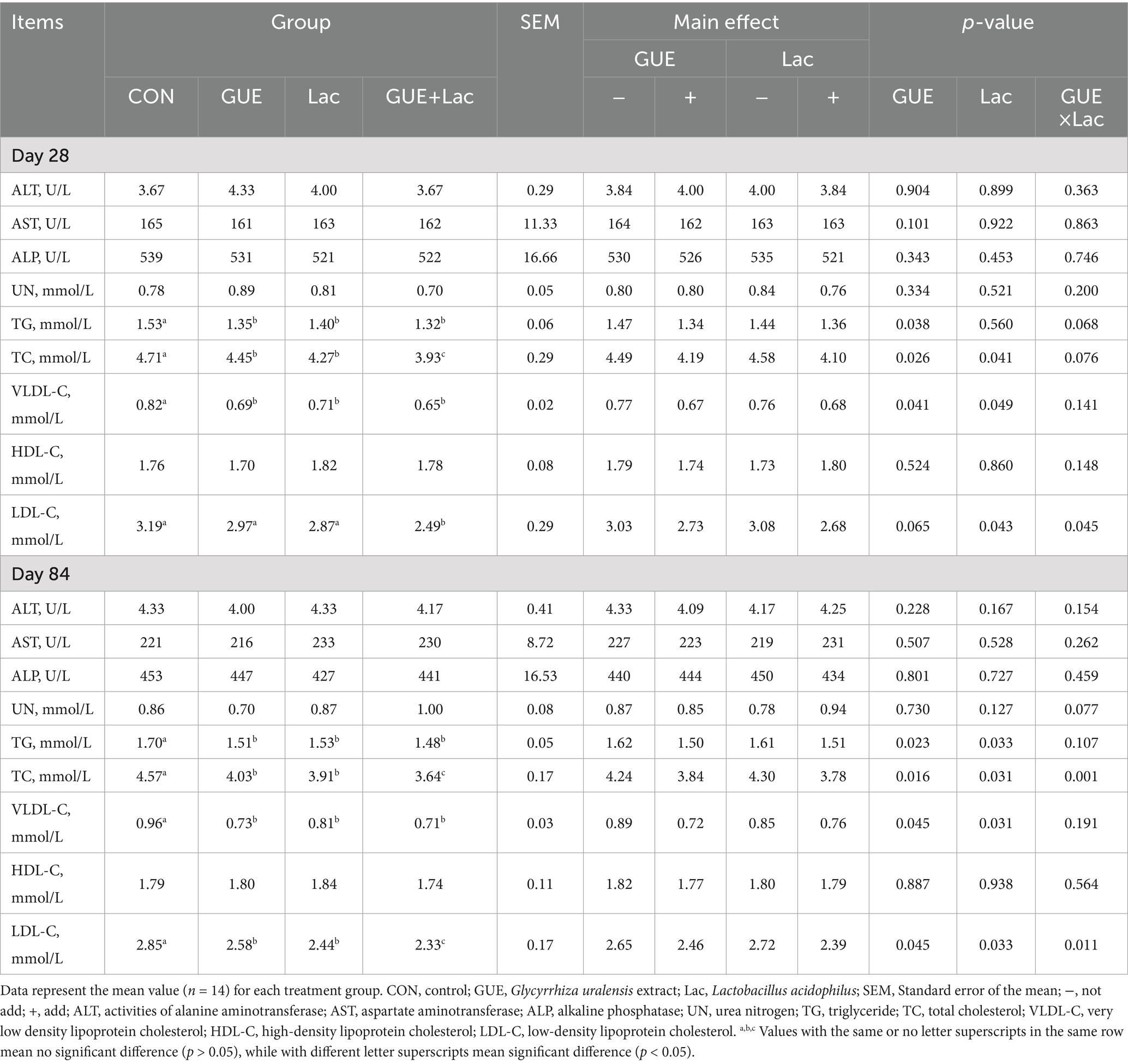 Serum TG and TC levels serve as important indicators of lipid transport in the body. HDL is involved in cholesterol removal and transport triglycerides back to the liver, LDL is responsible for delivering cholesterol to cells, and VLDL transports triglycerides from the liver to other tissues. These lipoproteins offer an insight into overall lipid metabolism. The Glycyrrhiza uralensis supplementation lowered serum TC and TG levels (45), and GUE reduced serum TC and LDL levels in broilers (29). L. salivarius decreased the serum TC, LDL-C and TG levels of broilers (46). Lactobacillus mixture reduced serum TC and TG levels but did not affect serum HDL-C and LDL-C levels in broiler (34). In this study, both GUE and Lac significantly reduced the serum TC, TG and VLDL-C levels in broilers at days 28 and 84, as well as serum LDL-C level at day 84, while their combination GUE+Lac group showed a interactive effect, leading to a more significant elevation in serum LDL-C and TC levels. This suggested that they promoted cholesterol and lipid metabolism, with their combination proving more effective, which was consistent with the decreased abdominal fat rate in broilers. Although the exact mechanism is not fully understood, previous research suggests that glycyrrhizic acid inhibits lipid peroxide formation and facilitates the conversion of cholesterol into bile acids (1), and prevents abnormal lipid metabolism in the liver by modulation of gut microbiota in rats fed a high-fat diet (47). Similarly, plant-derived pectic polysaccharides, such as those from Rubus chingii Hu., have been shown to inhibit intestinal lipid absorption in vivo, contributing to improved lipid profiles and reduced fat deposition (48). Lactobacillus decomposed cholesterol in the digestive tract and lowered serum cholesterol levels (49). It also incorporated cholesterol into bacterial cells and inhibited cholesteryl ester synthesis by reducing the activity of acetyl-CoA carboxylase and 3-hydroxy-3-methylglutaryl-CoA reductase (34).