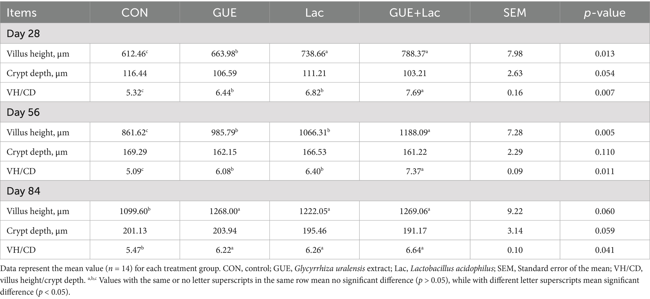 The intestinal barrier permits the uptake of essential nutrients and immune sensing while restricting pathogenic molecules and bacteria. Both structural and molecular components of the intestinal tract work together to perform this complex yet essential function. The integrity of the intestinal epithelium acts as a physical barrier against enteric pathogen invasion and ensures optimal nutrient absorption (78). Tight junctions (TJs) are the core structures that maintain intestinal barrier function, primarily composed of key proteins such as OCLN and ZO-1. MUC2 is the main component of the intestinal mucus layer, serving as the first physical and chemical barrier of the intestinal defense system. Upregulated TJ proteins improved barrier function and permeability, thereby reducing inflammation and oxidative stress (79). Our result indicated both GUE and Lac upregulated the mRNA expression of of ZO-1 and MUC2 in the jejunal mucosa at days 28, 56 and 84, as well as the expression of OCLN at days 28 and 84. Thus, the intestinal barrier function was enhanced. Several studies have documented the effects of Glycyrrhiza uralensis and its active components on the intestinal health of animals. Ibrahim et al. (16) found that GUE promoted the expression of junctional adhesion molecule 2 (JAM-2) and MUC-2 in the jejunal mucosa of broilers. Glycyrrhiza polysaccharide increased the villus height, the VH/CD ratio, and the expression of Ocludin, Claudin-1, and MUC2 in the mucosa of jejunum, ileum, and duodenum of broilers (8). Glycyrrhiza flavonoids improved the morphological structure of the intestine by increasing villus height and VH/CD in duodenum in piglets (80). Additionally, L.acidophilus has been shown to enhance intestinal health and protect against enteric pathogen invasion by increasing the VH/CD ratio and the expression of intestinal barrier function proteins in broilers (65, 81). L. plantarum enhanced the digestive enzyme secretion and increased nutrient digestibility by the increasing VH/CD ratio (82), and improved intestinal barrier function and permeability by upregulating the expression of MUC2, Occludin, and sIgA in the jejunum of broilers (83). These results suggest a promoting effect of GUE and Lac on intestinal development and functional improvement under normal conditions, consistent with the increased nutrient metabolism rate.