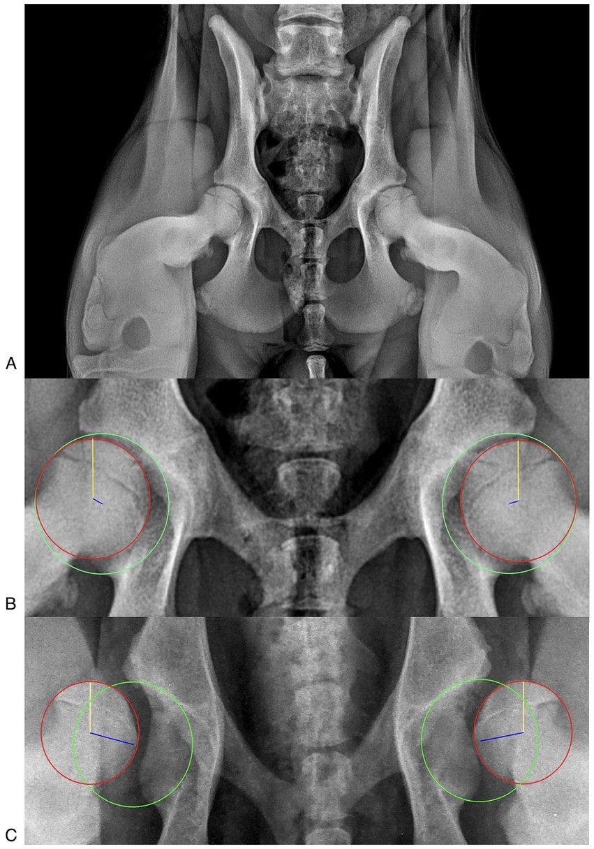 Figure 1. (A) Correct stress radiographic view. The obturator foramina and iliac wings are symmetrical, ensuring a straight pelvis. The femurs are symmetrical, and the femoral head is laterally displaced. (B) Laxity index (LI) measurement in a patient with an IL < 0.3. The acetabulum was delineated with a circumference passing through the craniolateral acetabular edge, the craniomedial acetabular edge, and the caudolateral acetabular edge (green circumference). Secondly, the head of the femur was delineated with a circumference passing through the cranial and caudal aspects of the head (red circumference). Finally, the distance (d, blue line) between the centers of the acetabulum circumference and the femoral head circumference was measured, and the LI was calculated (LI = d/r), where “r” was the radius of the circumference delimiting the femoral head (yellow line). (C) LI measurement in a patient with an IL > 0.7.