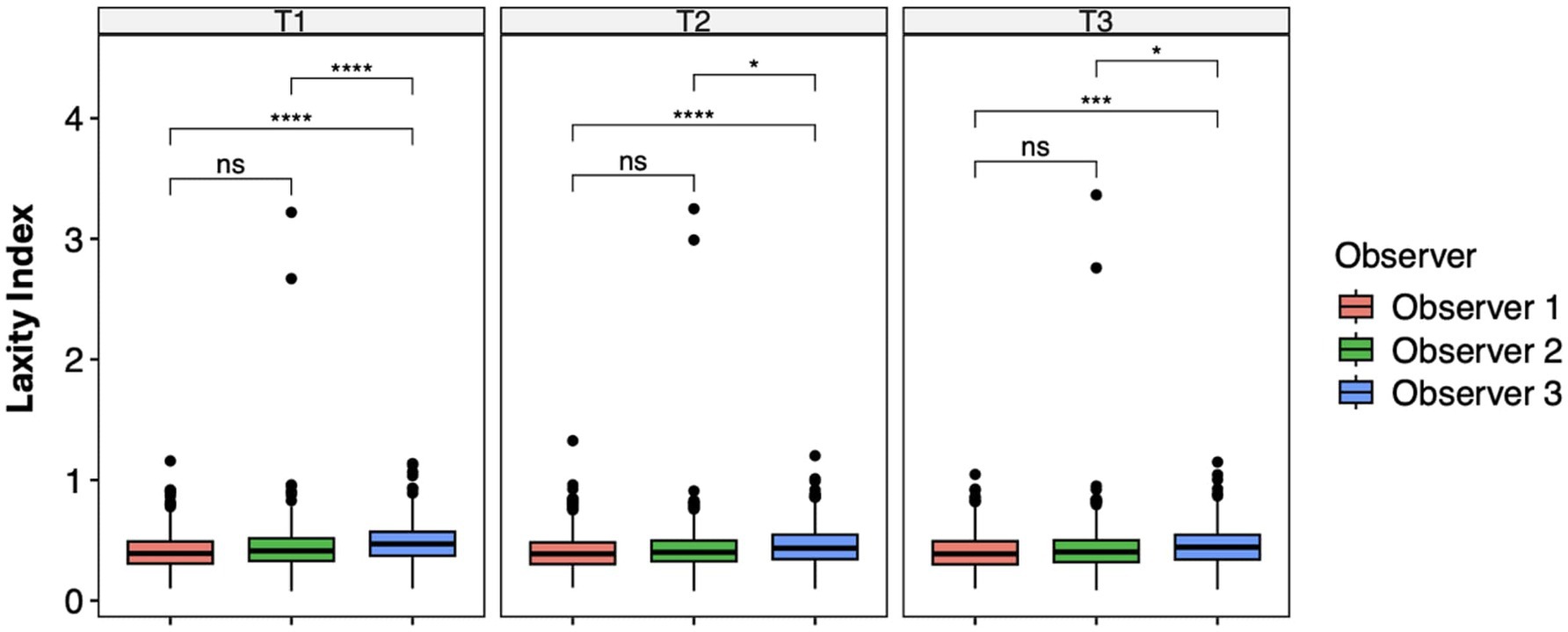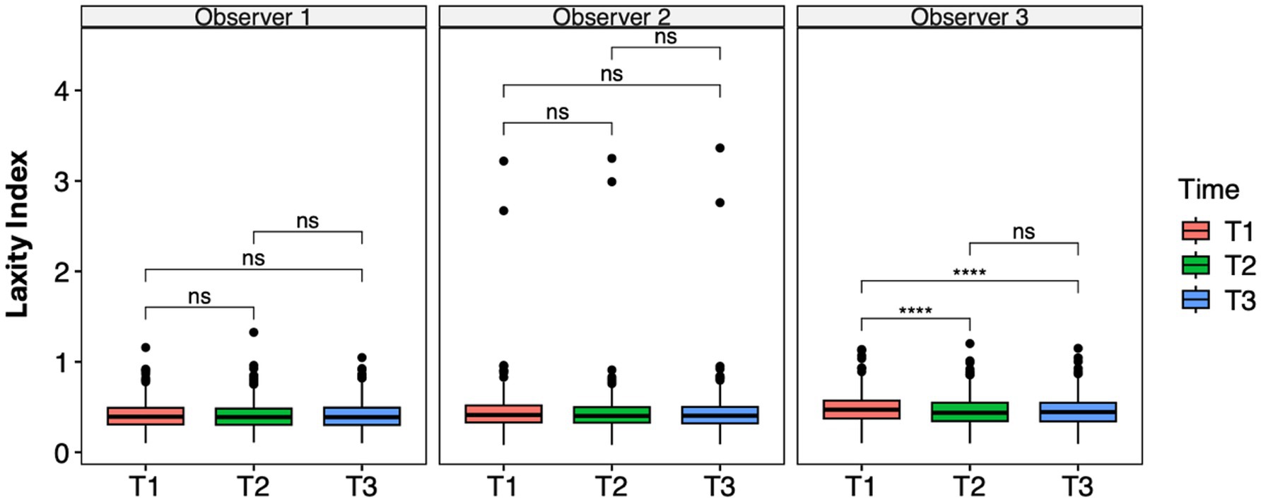 Figure 3. Laxity index distributions across time points within the observer groups. Mean differences were tested using a pairwise t-test for paired samples with Holm’s approach for p-value adjustment. An asterisk (*) indicates a significant difference (p < 0.05), specifically: ****(p < 0.0001), ***(p = 0.0001), **(p = 0.001), *(p = 0.01), and ns (p = 0.05 or p > 0.05).