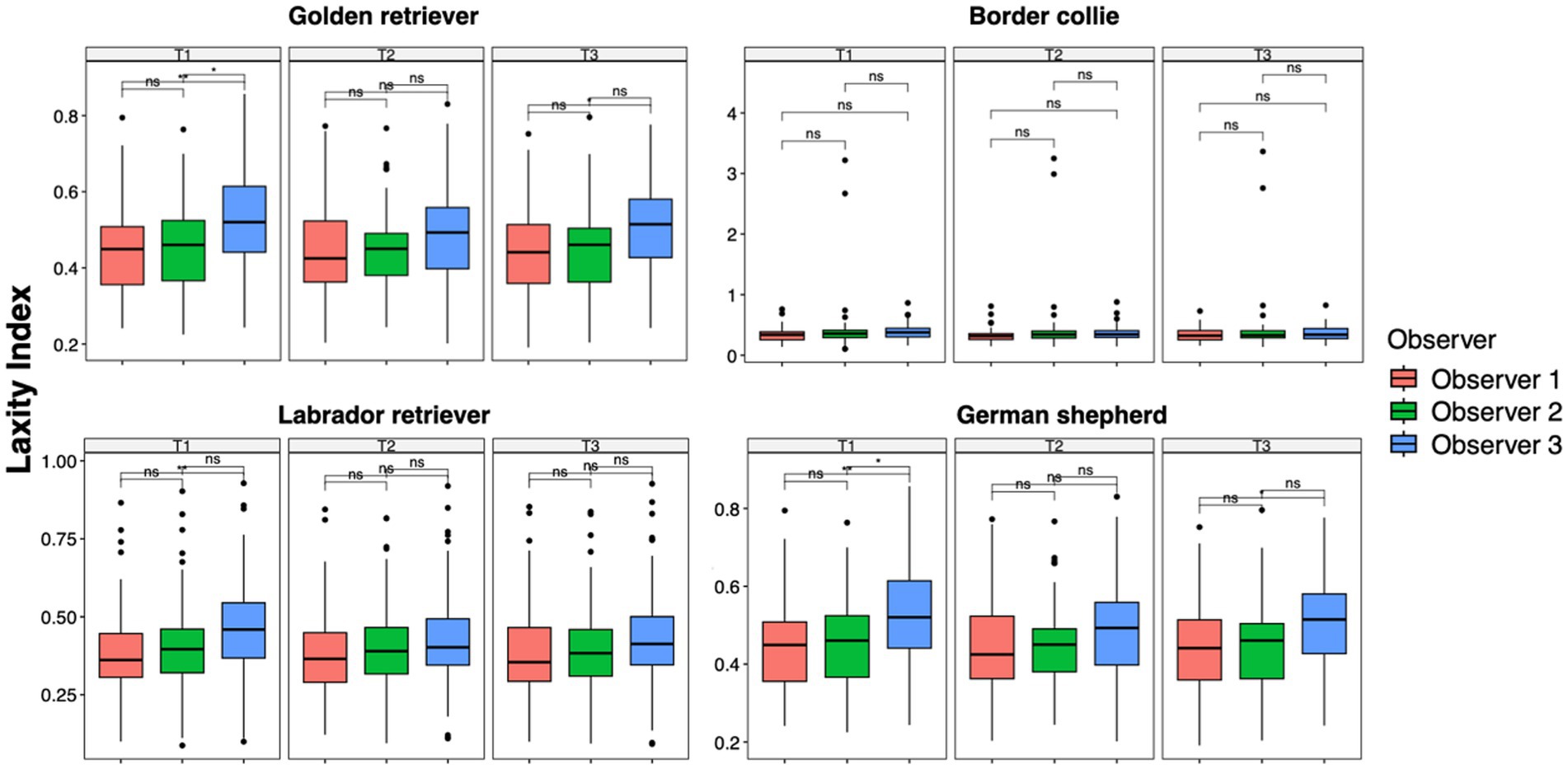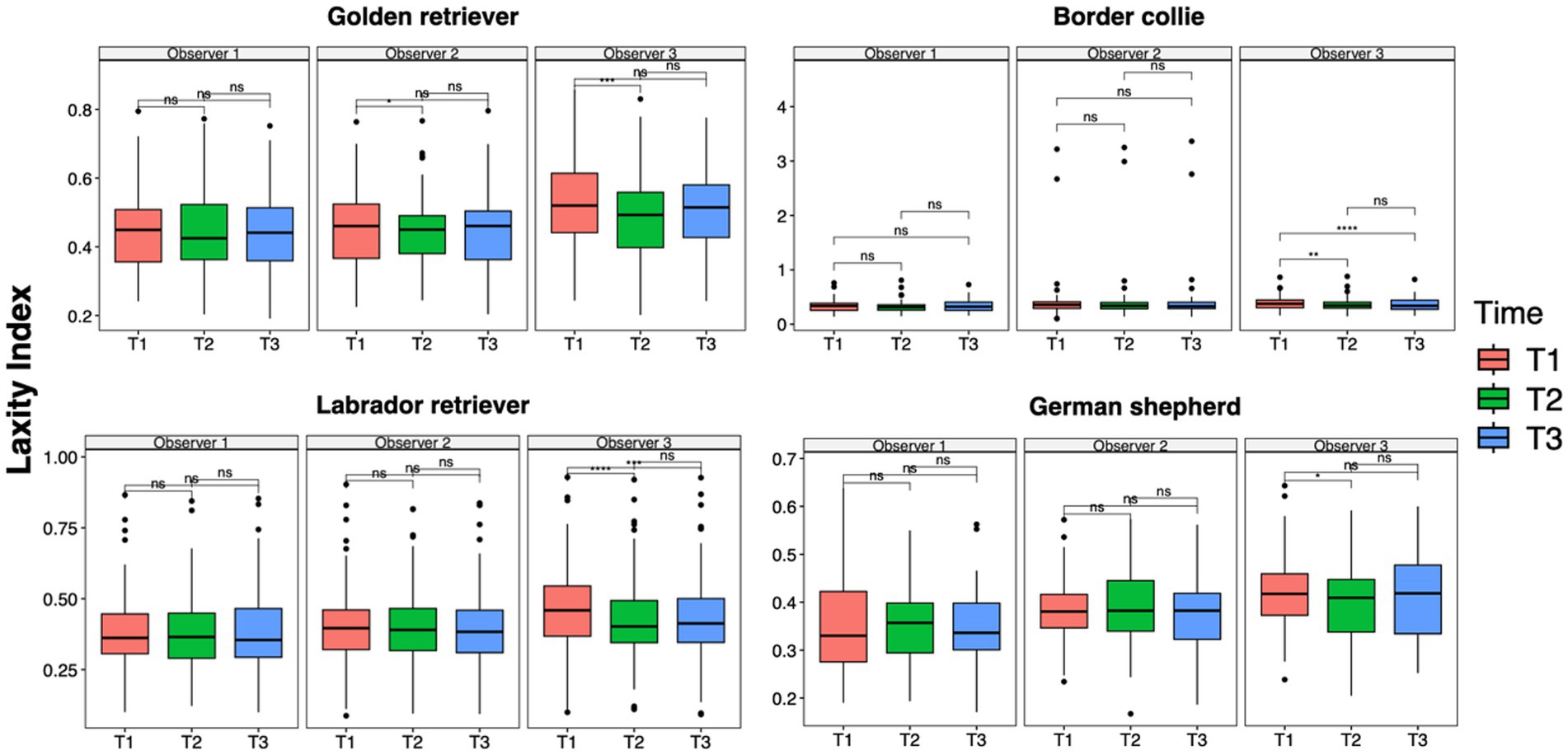 Figure 5. Laxity index distributions across the observer groups at intra-time points for Golden Retrievers, Border Collies, Labrador Retrievers, and German Shepherds. Mean differences were tested using a pairwise t-test for paired samples with Holm’s approach for p-value adjustment. An asterisk (*) indicates a significant difference (p < 0.05), specifically: ****(p < 0.0001), ***(p = 0.0001), **(p = 0.001), *(p = 0.01), and ns (p = 0.05 or p > 0.05).