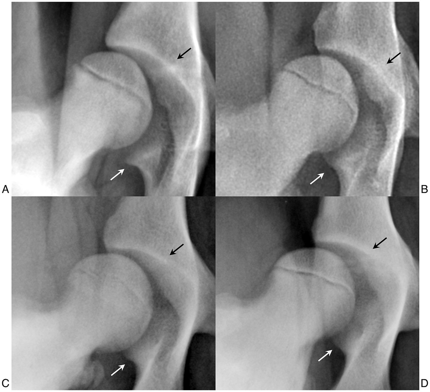 Figure 6. (A) Distracted hip joint of a 4.5-month-old female German shepherd. (B) Distracted hip joint of a 5-month-old female German shepherd. (C) Distracted hip joint of a 6-month-old male Labrador Retriever. (D) Distracted hip joint of a 5-month-old male Labrador Retriever. Images (B–D) show a caudal pillar (white arrows) that is slightly to moderately less pronounced than in images (A–C). Images C,D show a craniomedial acetabular edge (black arrows) that is more defined than in images (A,B).