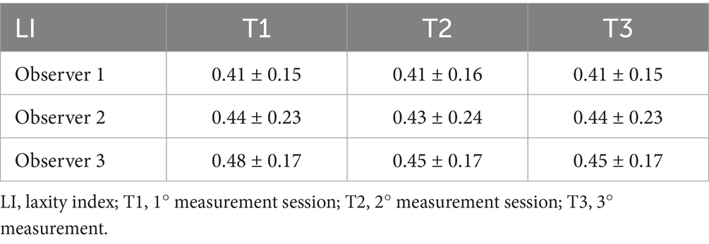 Table 2. The mean difference of the Laxity index between the observer groups at the intra-time point was obtained using a linear mixed model.