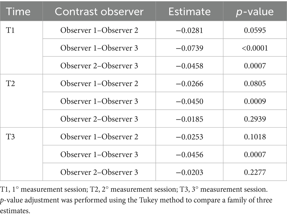The ANOVA test and the pairwise t-test with Holm’s approach for p-value adjustment revealed significant differences between Observer 1 and Observer 3 (T1, p < 0.0001; T2, p < 0.0001; T3, p = 0.0001) and Observer 2 and Observer 3 (T1, p < 0.0001; T2, p = 0.01; T3, p = 0.01) at each measurement session. No significant difference was recorded between examiners 1 and 2 (Figure 2).