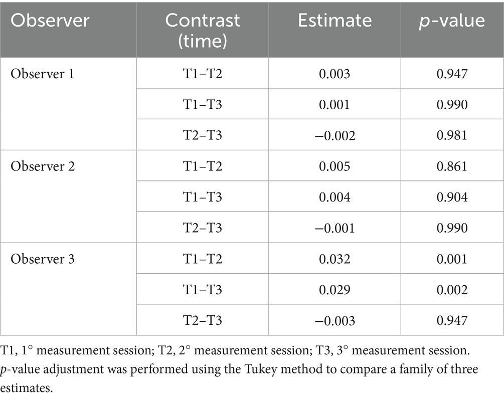 A significant difference was observed between the first and the second measurement sessions (p < 0.001) and the first and the third sessions (p = 0.001) in Observer 3, as indicated by the ANOVA test and pairwise t-test (Figure 3), consistent with the results from the LMM (Table 3). The mean difference was 0.032 between T1 and T2 and 0.029 between T1 and T3.