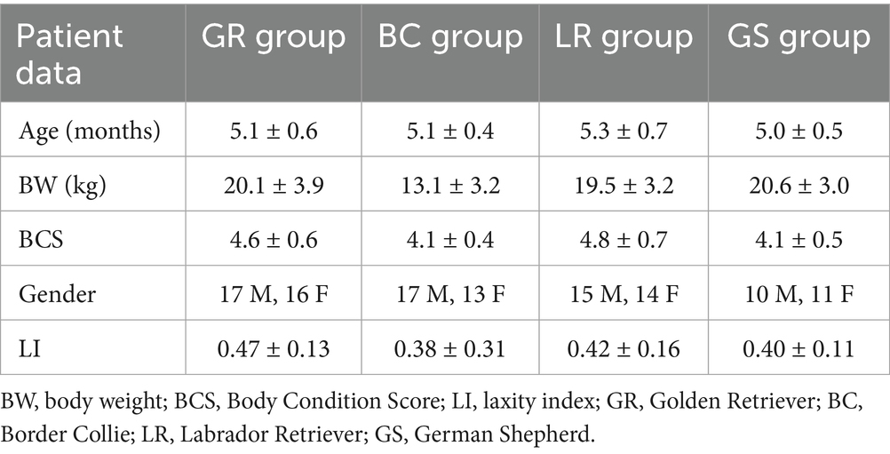 Dividing the study population by breed, 4 breed groups with more than 20 dogs were identified: Golden Retriever (GR) group, Border Collie (BC) group, Labrador Retriever (LR) group, and German Shepherd (GS) group. The mean ± SD values for age, BW, BCS, and LI, as well as the sex distribution of groups, are shown in Table 4.
