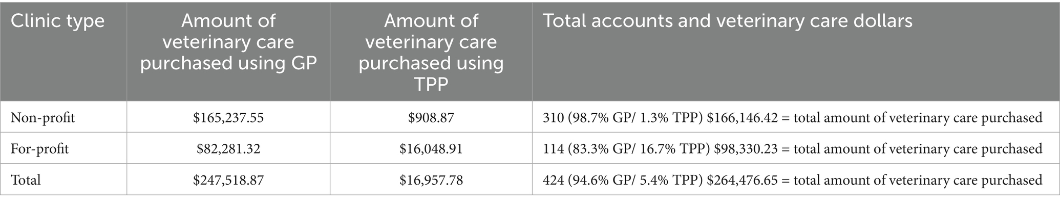 Of the participating clinics, the 4 non-profits were the top users of the payment options by initiating 73.1% (310 of the 424) of the client accounts for 74.3% of the cases (330 of the 444 animals), accounting for 62.8% of the purchased veterinary care ($166,146.42 of $264,476.65 of total veterinary care with Varidi). The non-profit clinics reported that their clients were either predominantly low-income (two clinics) or economically diverse (two clinics). The median monthly income directly reported by these clients was $2,500 ($30,000 annually). Three of the non-profit clinics strongly agreed or agreed with the statement, “Payment options like Varidi will enable us to expand the care that we can provide to clients in financial need, thereby expanding the care that clients can access.”