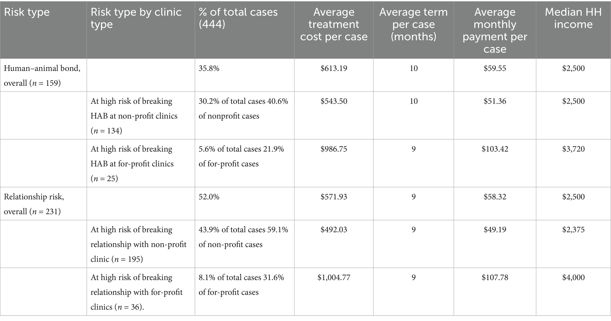 The researchers analyzed negative risks to the human–animal bond and the veterinary-client-patient relationship using “very likely” responses to outcomes if the payment plan was not available as follows, per case: