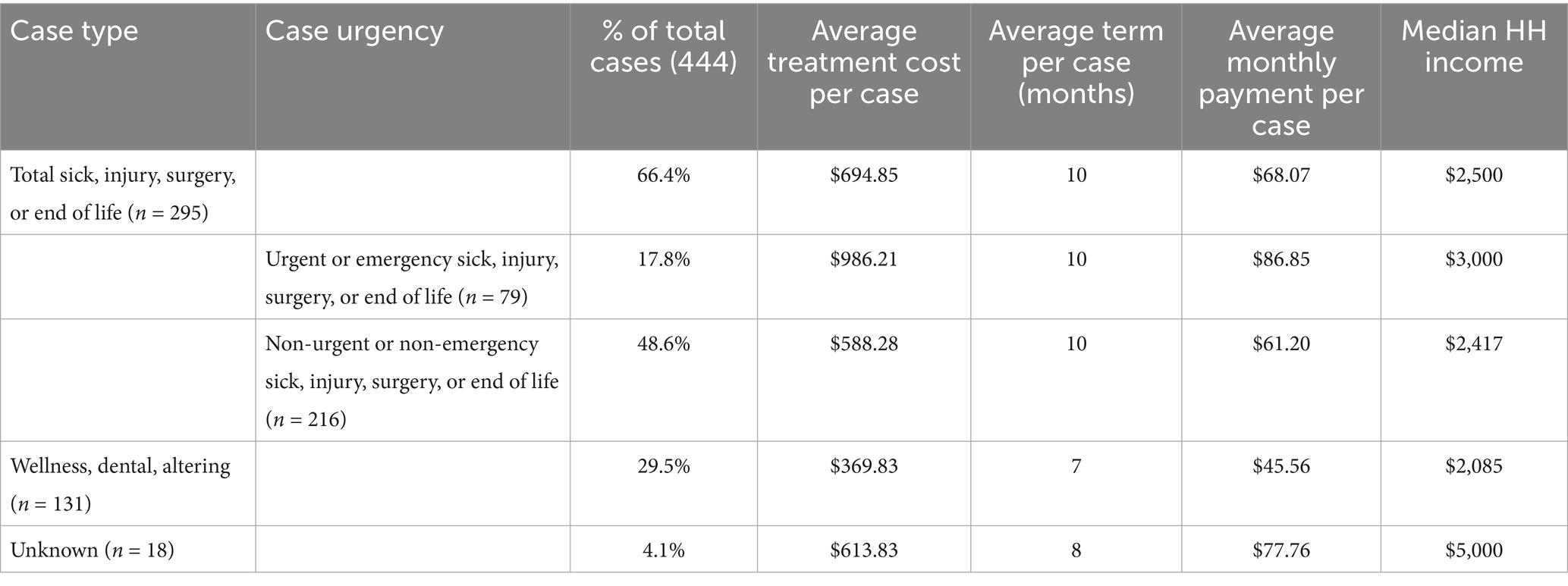 The researchers recoded clinic-reported care provided into treatment types (e.g., sick) and also by the urgency of the care needed (e.g., emergency). If the account was opened for more than one care plan, the researchers selected the less discretionary, higher-level care for analysis. If the type of care or urgency could not be discerned by the researchers, it was coded as “unknown.” Because some client accounts were opened for care for more than one pet (e.g., three puppies being treated for parvovirus), the researchers analyzed the data by both individual cases (animals served) and by client payment accounts (Table 3).