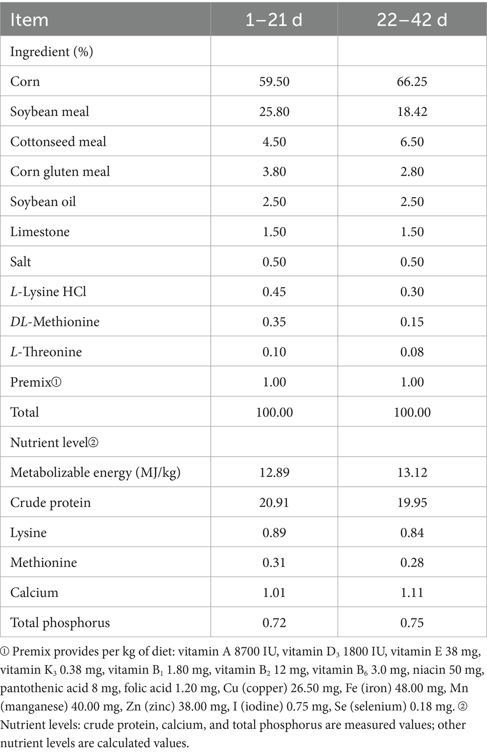 Hunan Agricultural University Animal Ethics Committee (Changsha, China) reviewed and approved all experimental protocols. A total of 400 one-day-old, healthy Arbor Acres broilers with uniform body conditions were randomly divided into 5 groups, each containing 8 replicates of 10 birds. The experiment followed a single-factor randomized design: the control group was fed a basal diet; the unfermented herbal group received the basal diet supplemented with 1% unfermented Chinese herbal medicine; and the three experimental groups were fed the basal diet supplemented with 0.5, 1, and 1.5% bacteria-enzyme co-fermented Chinese herbal medicine, respectively. The basal diet was formulated according to the nutritional requirements of Arbor Acres broilers, and its composition and nutrient levels are presented in Table 1. All birds had free access to feed and water throughout the 42-day trial period. Upon completion of the feeding trial, 3 birds were randomly selected from each replicate for a 4-day metabolic trial to determine the apparent digestibility of nutrients.