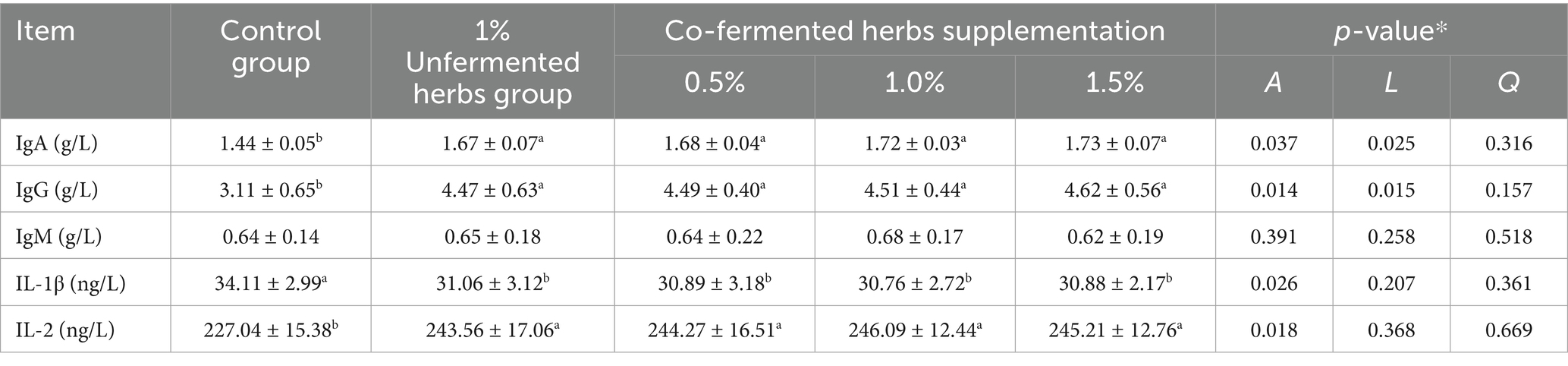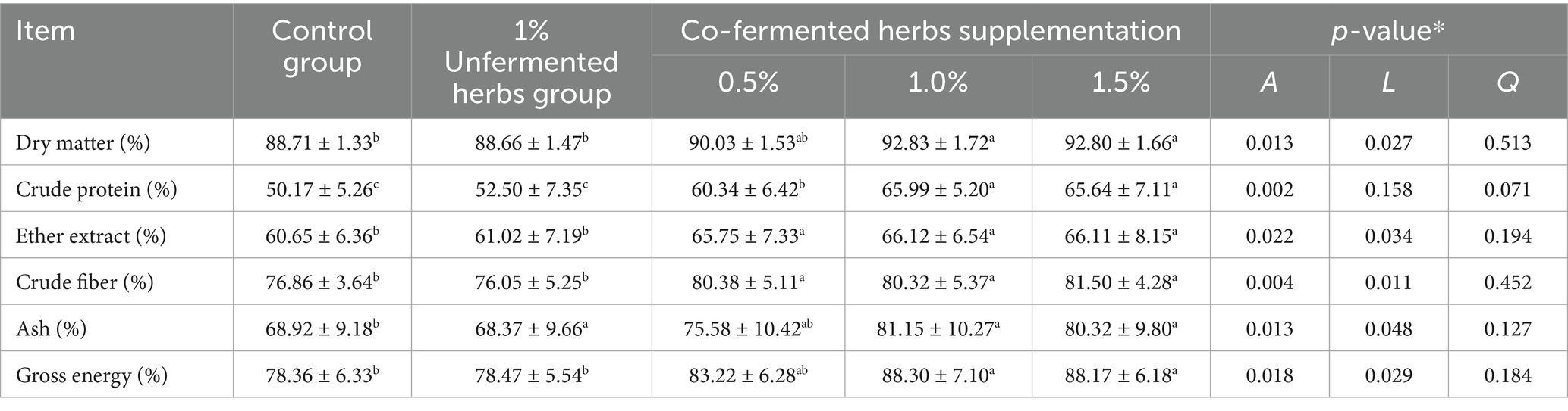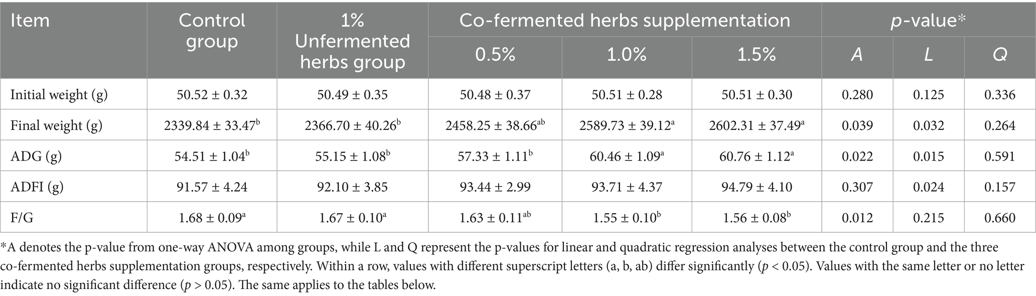 Final results are presented as mean ± standard deviation (SD). Data were initially processed using box plots in SPSS 22.0 and assessment of variance homogeneity. Subsequently, one-way analysis of variance (ANOVA) was performed for all experimental groups. For datasets showing significant differences, multiple comparisons were conducted using Duncan’s multiple range test. Linear and quadratic regression analyses were conducted on the control group and the three co-fermented herbs supplementation groups to determine whether there was a dose-effect relationship of the supplementation levels. Statistical significance was defined at p < 0.05.