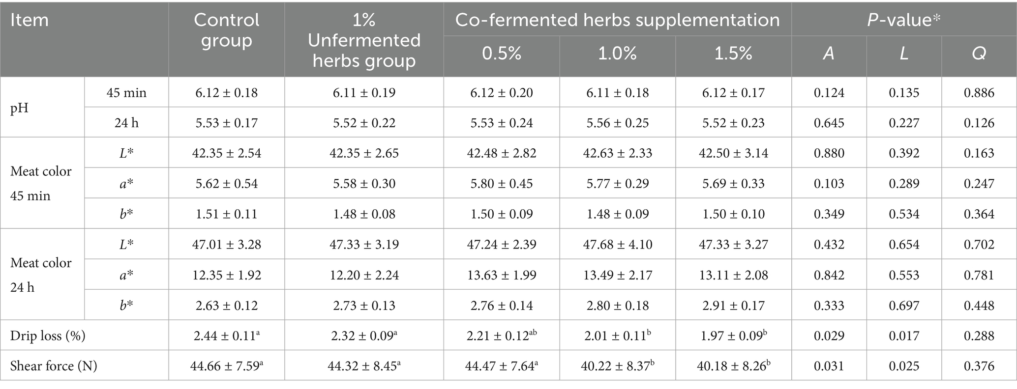 Broiler meat quality is intricately linked to genetic strain, dietary composition, rearing environment, and slaughter protocols, where its enhancement critically extends shelf life and consumer appeal. Various phytochemicals found in herbs—including flavonoids, saponins, and phenolics—can modulate lipid metabolism, thereby influencing muscle flavor and texture (31–33). For instance, berberine from Coptis chinensis suppresses lipogenic enzymes, which reduces abdominal and subcutaneous fat deposition while promoting fatty acid oxidation (34). Additionally, Codonopsis polysaccharides have been shown to enhance protein deposition and elevate the levels of flavor-enhancing amino acids, such as glutamate and aspartate (14, 15). Meanwhile, hesperidin in Citri Reticulatae Pericarpium upregulating antioxidant enzymes to mitigate heat stress and preserve post-slaughter color and water-holding capacity (35), where water-holding capacity dictates shelf stability. Crucially, our data demonstrate that 1–1.5% co-fermented herbs significantly improved water-holding capacity and reduced shear force in broilers, confirming their efficacy in enhancing meat quality.