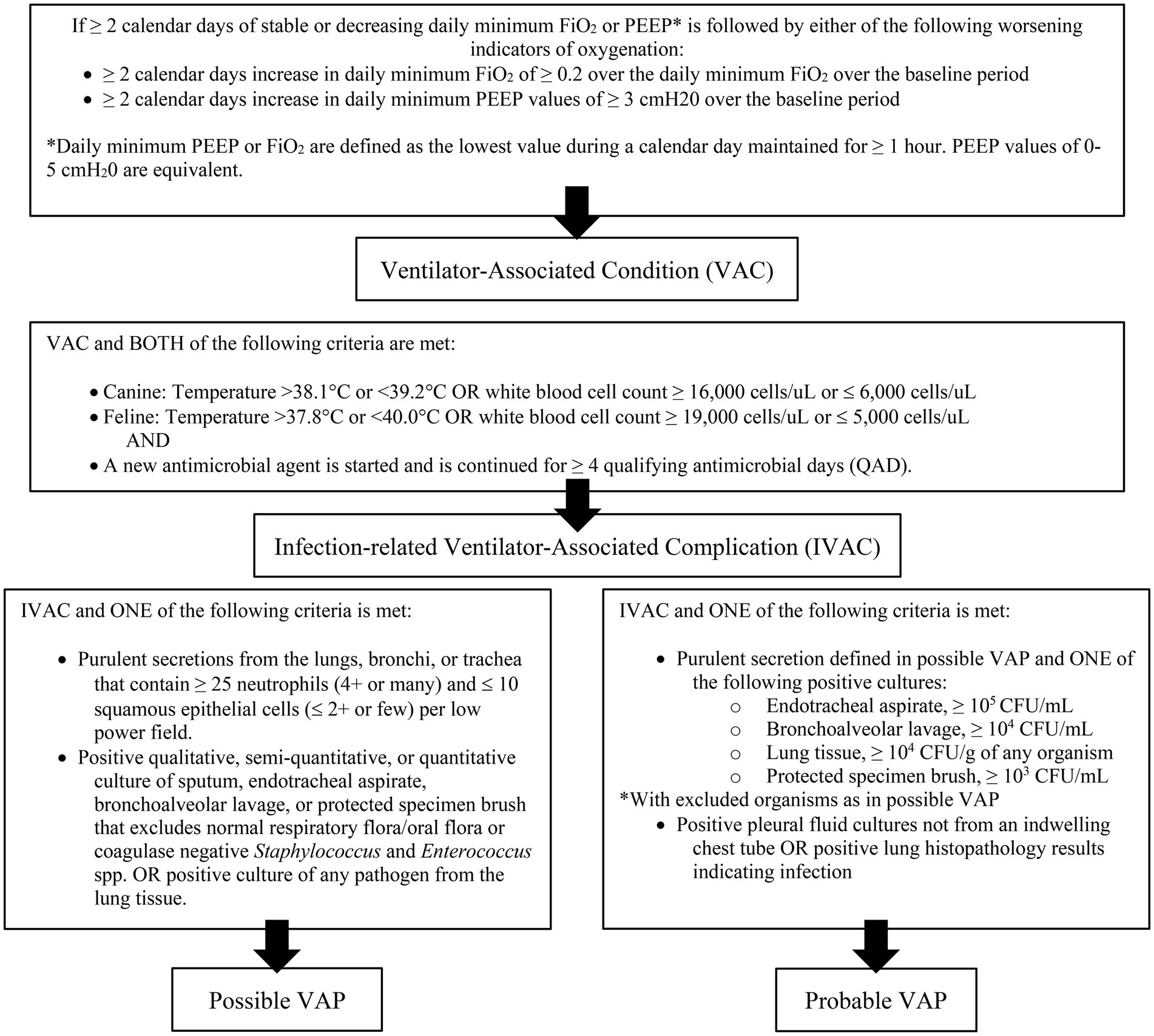 Criteria based on the CDC surveillance guidelines for VAP (Figure 1) and the modified guidelines for veterinary medicine (Figure 2) were used to retrospectively to determine if VAC, IVAC, PVAP were present. Additionally, clinician suspicion was noted if there was discussion of VAP within the medical record which was based on if the dog had worsening ventilatory status [need for increased FiO2 ≥ 0.2 or positive end expiratory pressure (PEEP) ≥ 3 cmH2O], developed a fever (same criteria as above), inflammatory leukogram (same criteria as above), had pulmonary infiltrates on thoracic imaging or were culture positive. Multidrug resistance (MDR) was defined as resistance to three or more classes of antimicrobials to which the organism is usually susceptible.