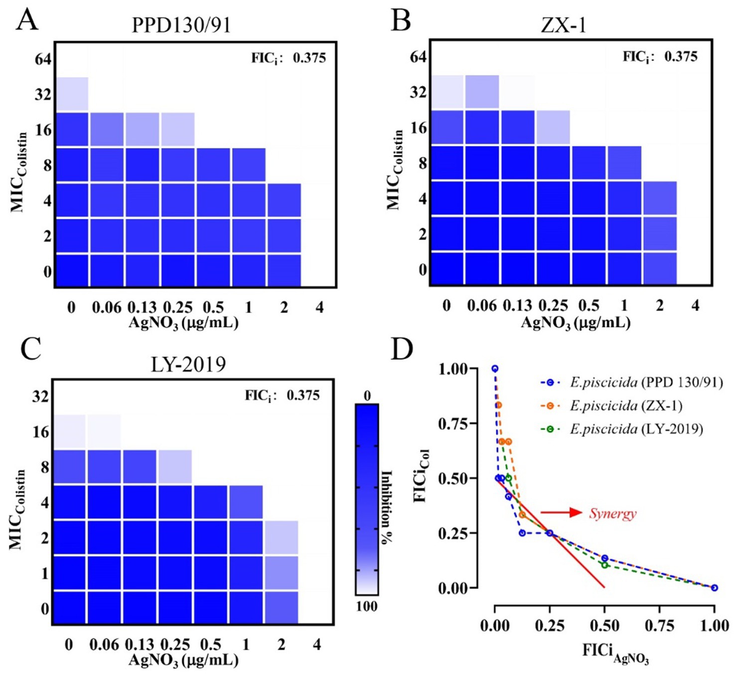 Figure 1. Synergistic effect of AgNO3 and colistin against three E. piscicida isolates. Representative heat maps of checkerboard assays for AgNO3 combined with colistin against E. piscicida isolates. (A) PPD130/91, (B) ZX-1, and (C) LY-2019. The darker blue areas represent greater bacterial cell density. (D) Isobolograms of the combination of AgNO3 and colistin against three E. piscicida isolates. The red full line indicates ideal isobole, and data points below it (<0.5) represent synergy. The checkerboard and FICi data are from at least three biological replicates (n = 3).