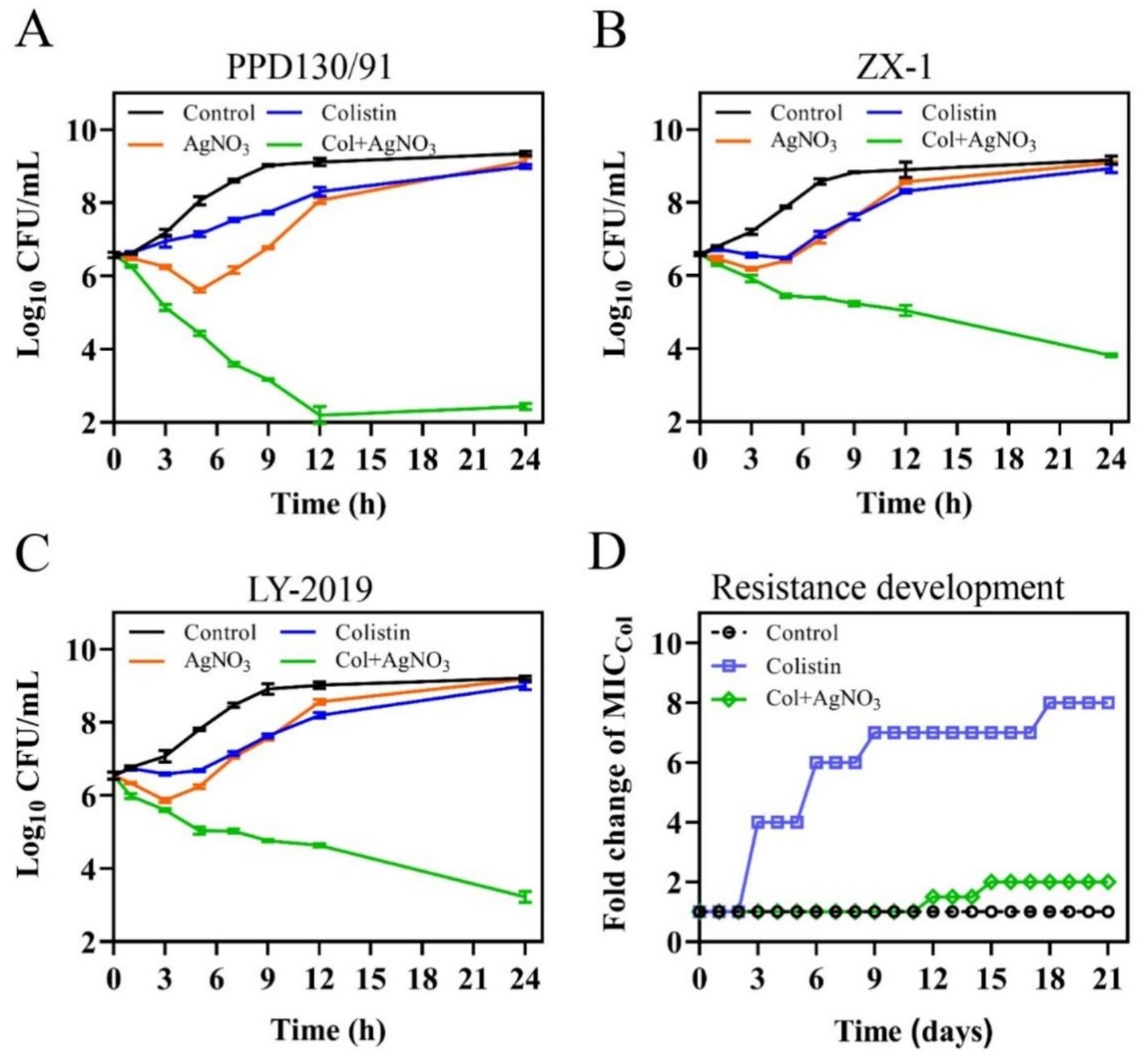 Figure 2. AgNO3 restores the sensitivity of naturally colistin resistant E. piscicida to colistin and suppresses the evolution of colistin resistance. (A–C) Time-dependent kill curves of three colistin-resistant E. piscicida isolates by the combination of AgNO3 (1.0 μg/mL), colistin (col, 16.0 μg/mL). (A) PPD130/91, (B) ZX-1, and (C) LY-2019. (D) Resistance acquisition curve of E. piscicida PPD130/91 in the presence of colistin alone or in combination with AgNO3 during a 21-day serial passage. The values are expressed as mean ± SD (n = 3).