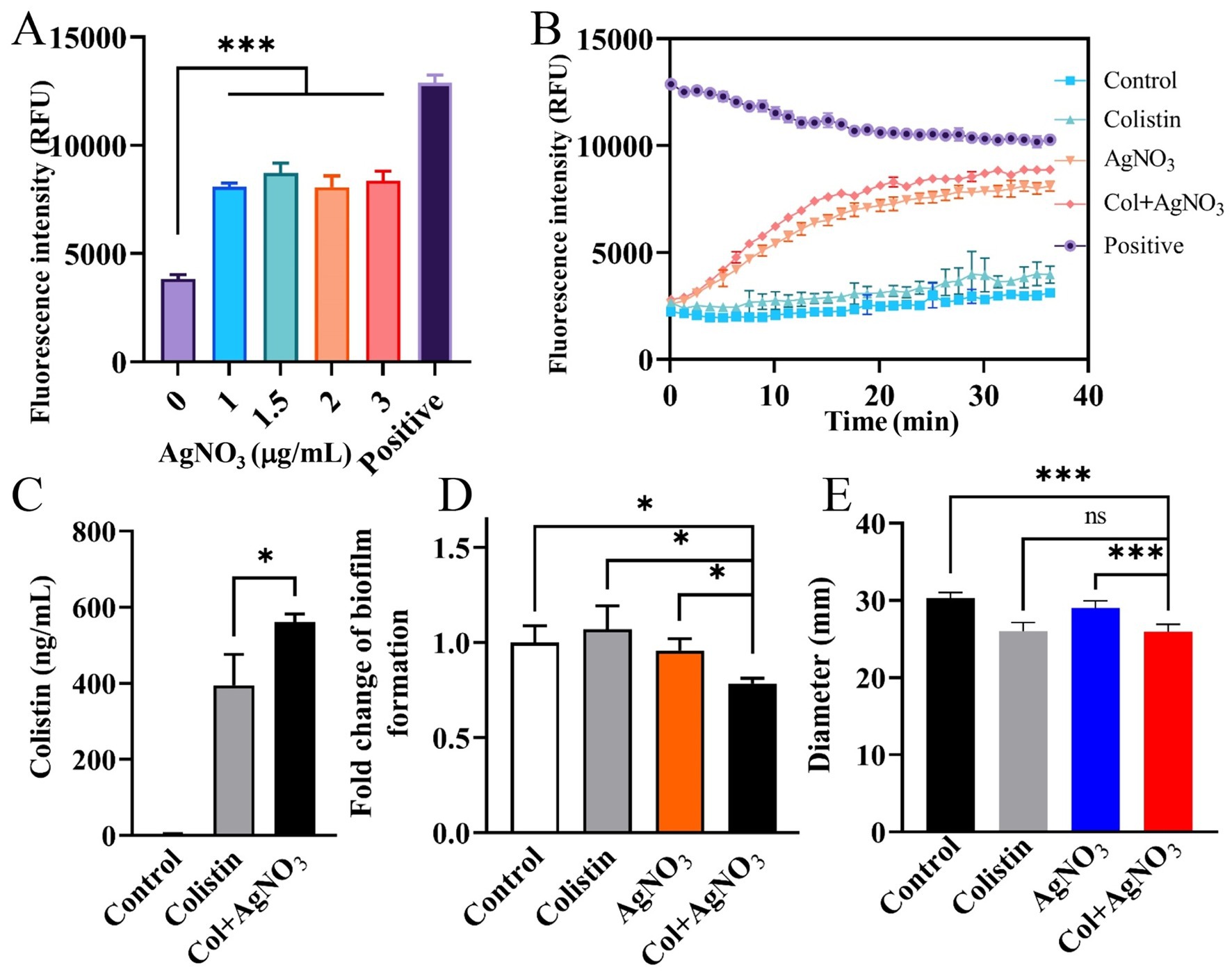 Changes in efflux pump activity were evaluated by monitoring the accumulation of Hoechst 33342 dye. E. piscicida cells were first treated with colistin (16.0 μg/mL), AgNO3 (1.0 μg/mL), or their combination at 25 °C for 30 min, then stained with 2.5 μM Hoechst 33342. Heat-inactivated bacterial cells were used as the positive control. The fluorescence intensity of accumulated Hoechst 33342 was measured using a microplate reader (excitation at 355 nm/emission at 460 nm).