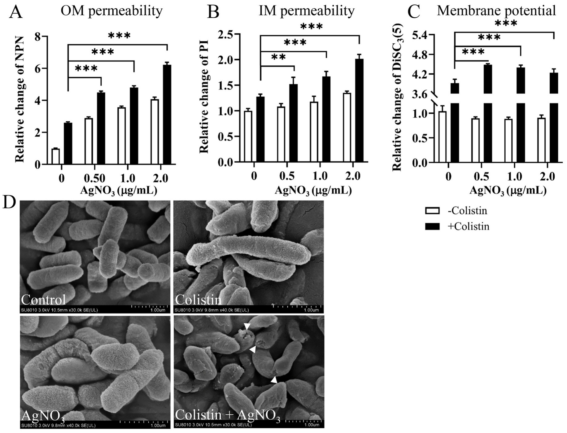 Figure 4. AgNO3 potentiates colistin’s membrane damage activity and dissipates the proton motive force. (A) AgNO3 potentiates the outer membrane (OM) permeability. (B) AgNO3 potentiates the inner membrane (IM) permeability. (C) AgNO3 dissipates the proton motive force (PMF). The fluorescence intensities of NPN, PI and DiSC3(5) were, respectively, used to evaluate the OM permeability, IM permeability and PMF after exposure to increasing concentrations of AgNO3 with constant colistin. (D) Morphological observation of E. piscicida PPD130/91 after exposure to colistin, AgNO3, or colistin + AgNO3. Scar bar, 1.0 μm. The values are expressed as mean ± SD (n = 4), and statistical differences were tested by two-way ANOVA analysis. (**p < 0.01 and ***p < 0.001).