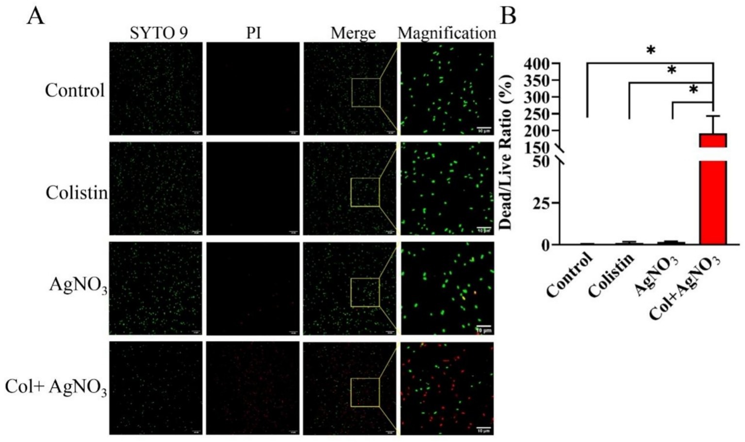 Figure 5. LIVE/DEAD staining to depict the synergistic effect of AgNO3 and colistin against E. piscicida. (A) Representative fluorescence images of strain PPD130/91 after exposure to the colistin and/or AgNO3 using two-color dyes Syto9 and PI from the LIVE/DEAD bacterial cell viability kit. (B) Dead/live ratio of strain PPD130/91 after exposure to the colistin, AgNO3, or colistin + AgNO3 for 1 h. The values are expressed as mean ± SD (n = 4), and statistical differences were tested by one-way ANOVA analysis. (*p < 0.05).
